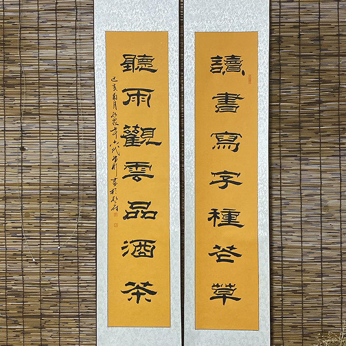 对联:读书写字种花草 听雨观云品酒茶