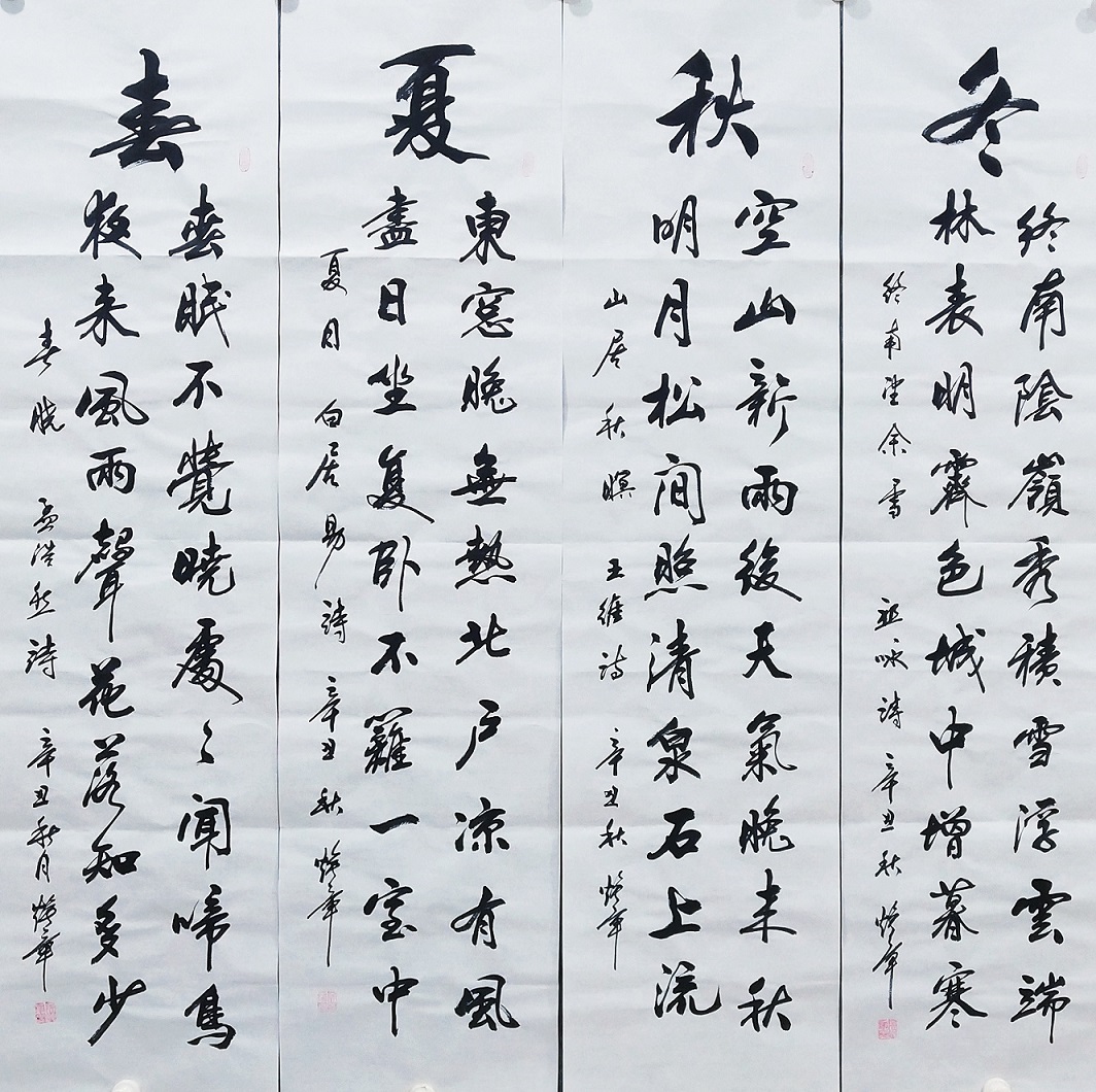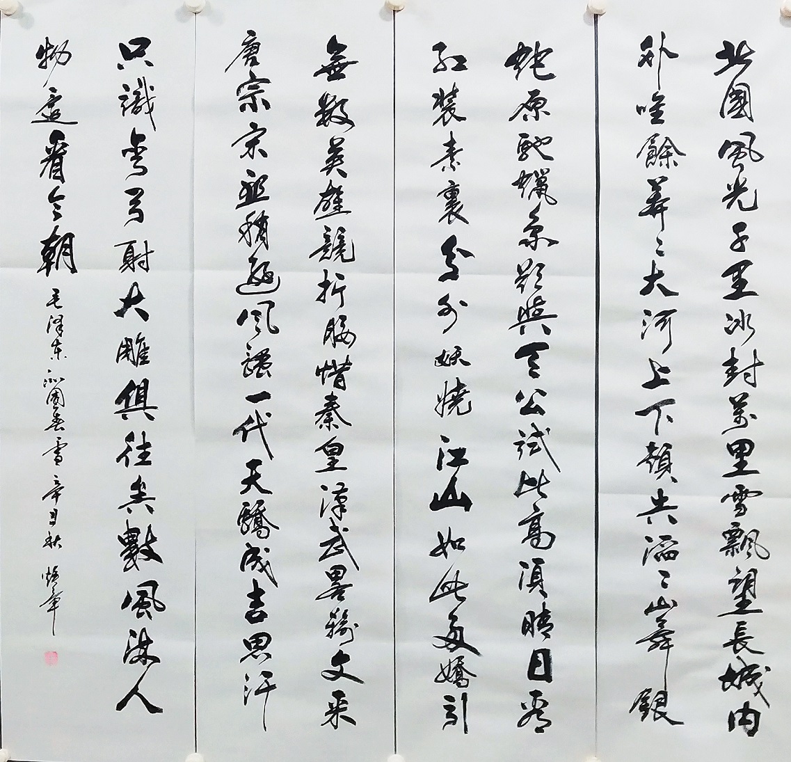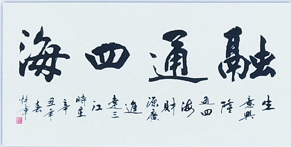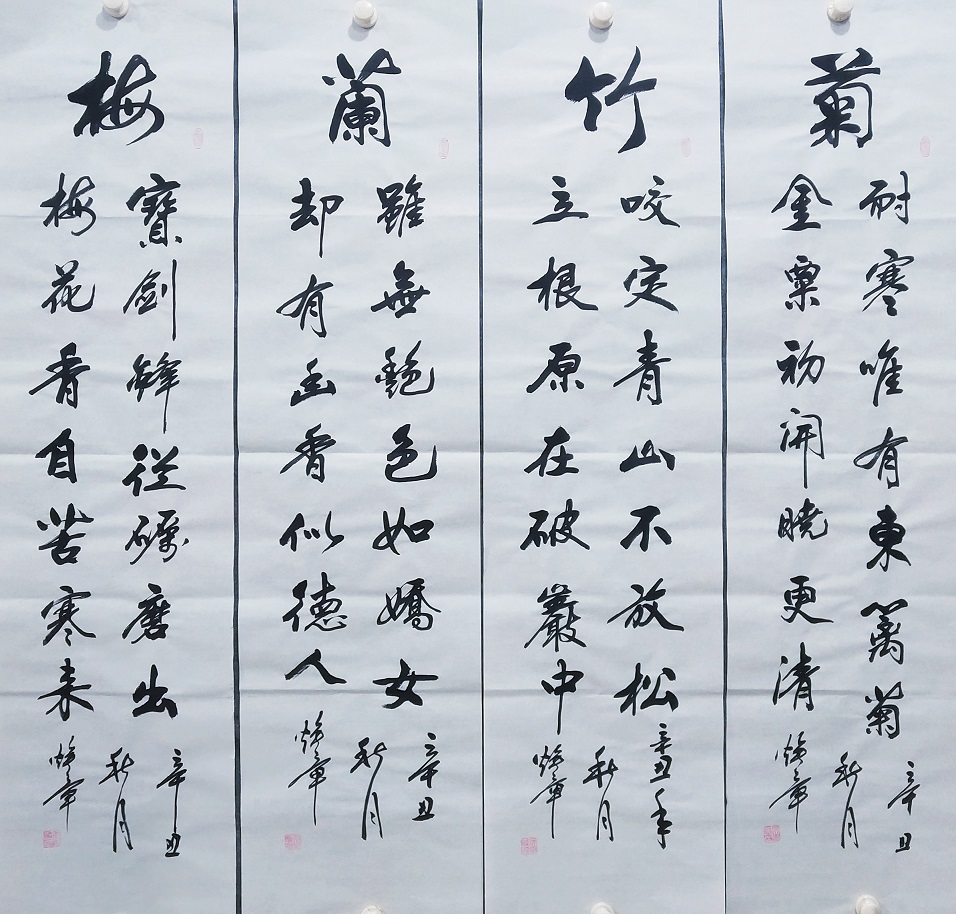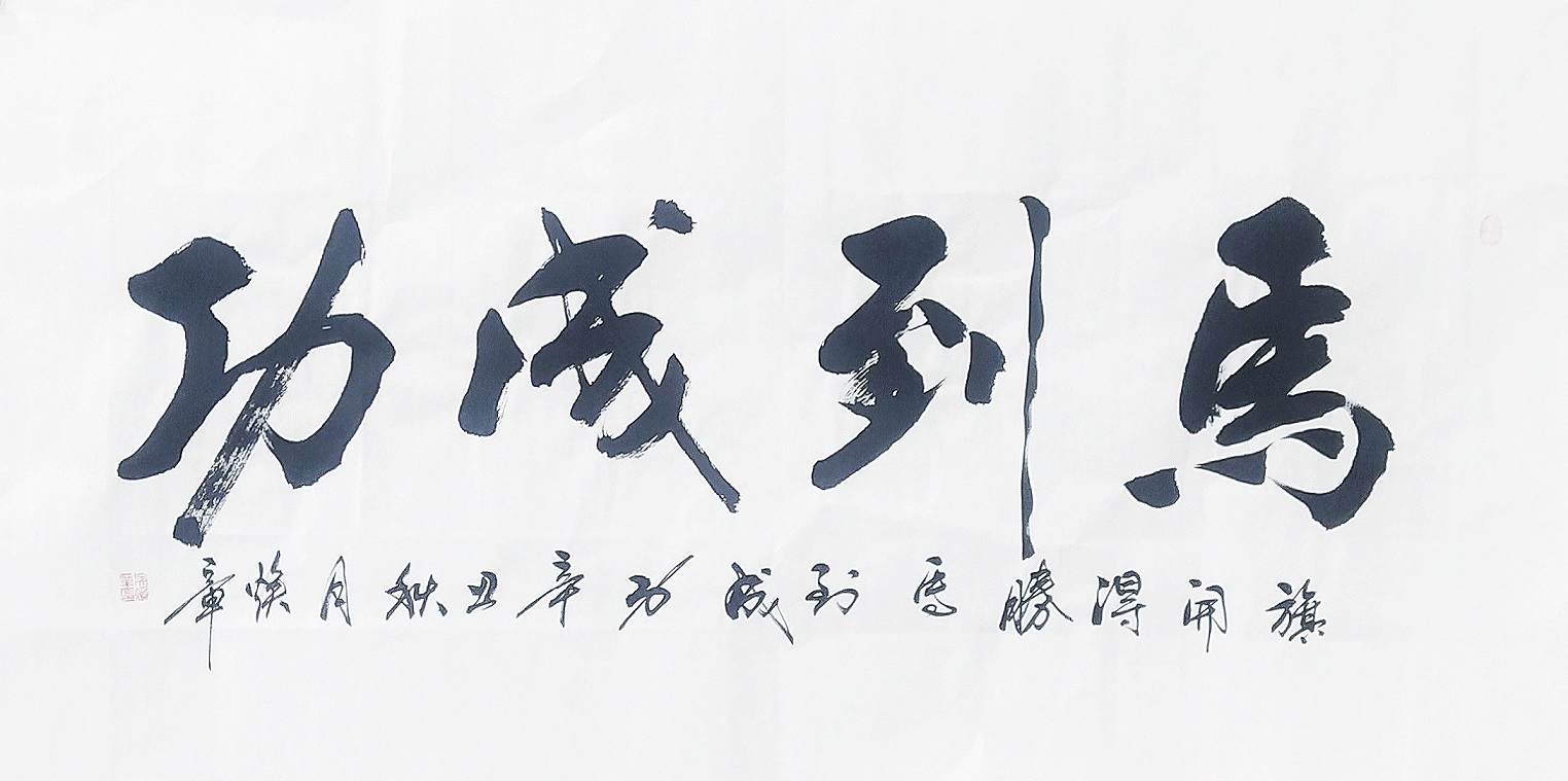 书法的本质属性,事实上是线条塑造为主的真谛,把线条写到游刃有余,就可以面对粉壁长廊数十间,以成刹那之间千万字。吴培玺的字,线条塑造的意识特别强,功夫也特别到位。执笔在于手,运笔在于手,心手相师可以依势而成,作出八面出锋的铺陈!一划之间变起伏于锋杪,一点之内殊衄挫于毫芒!上下翻飞,左右挥洒,在极好的节奏里,把书法线条写得若是万类之象!果然有同自然之妙有,非力运所能成的佳作频频而成。这么强的书法创作能力,绝非匠工而能成,必是入神方可作!