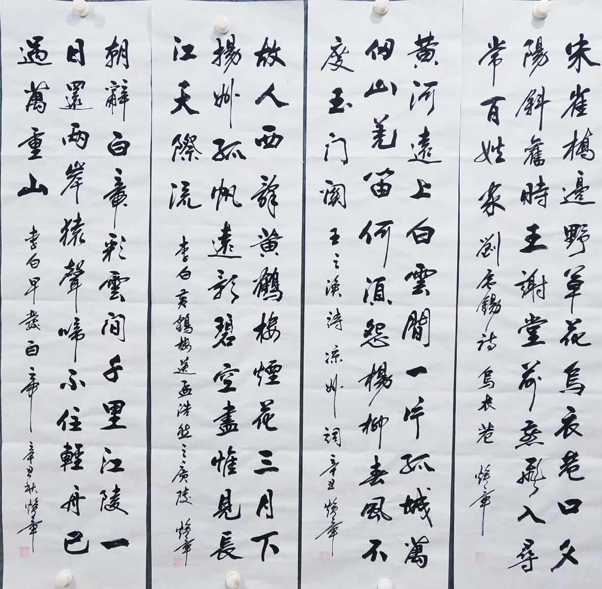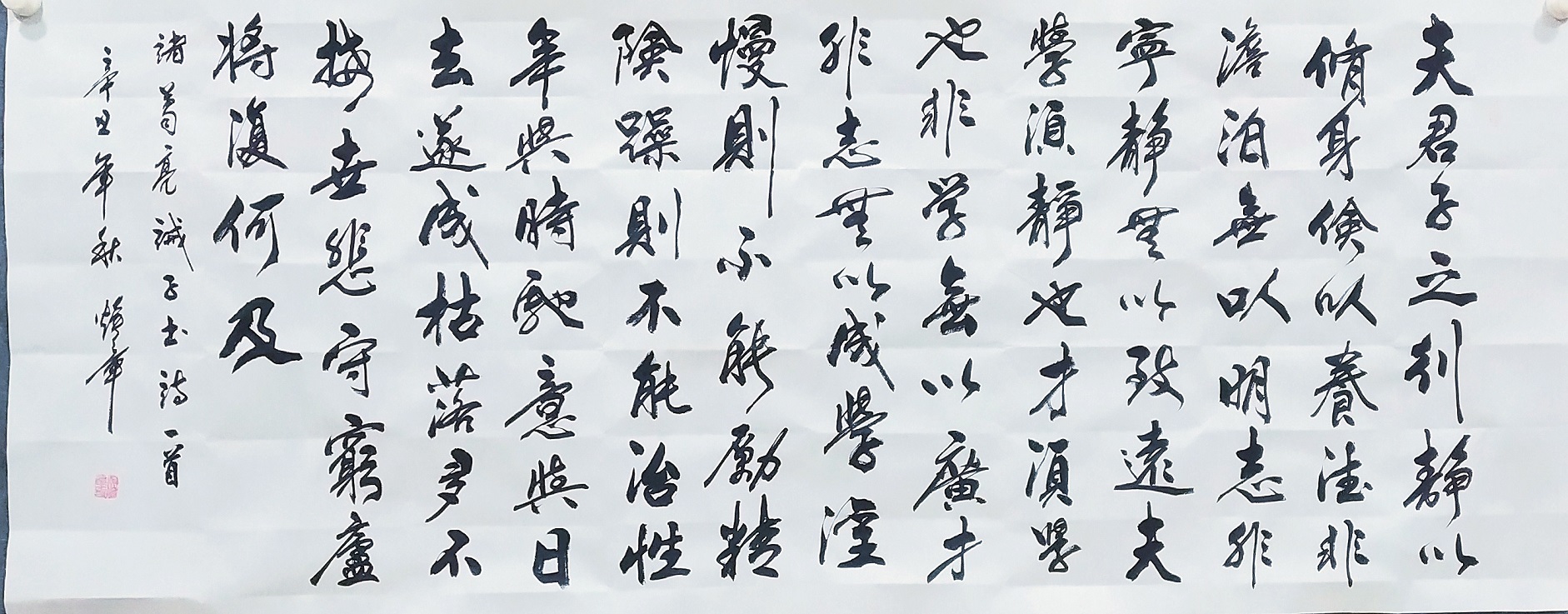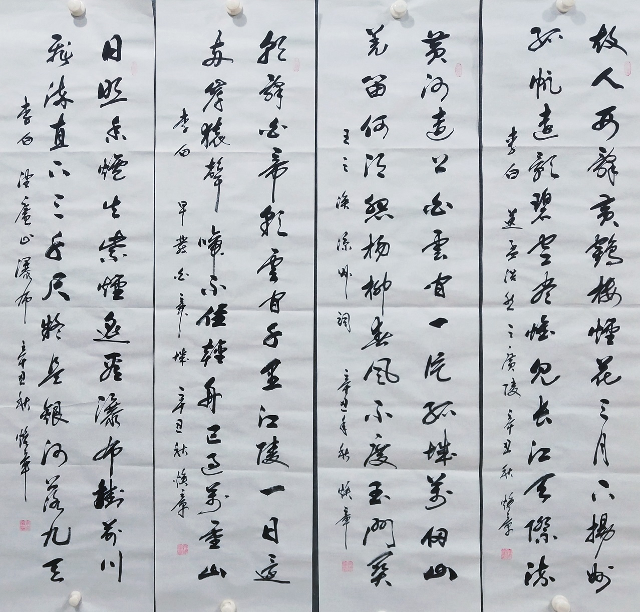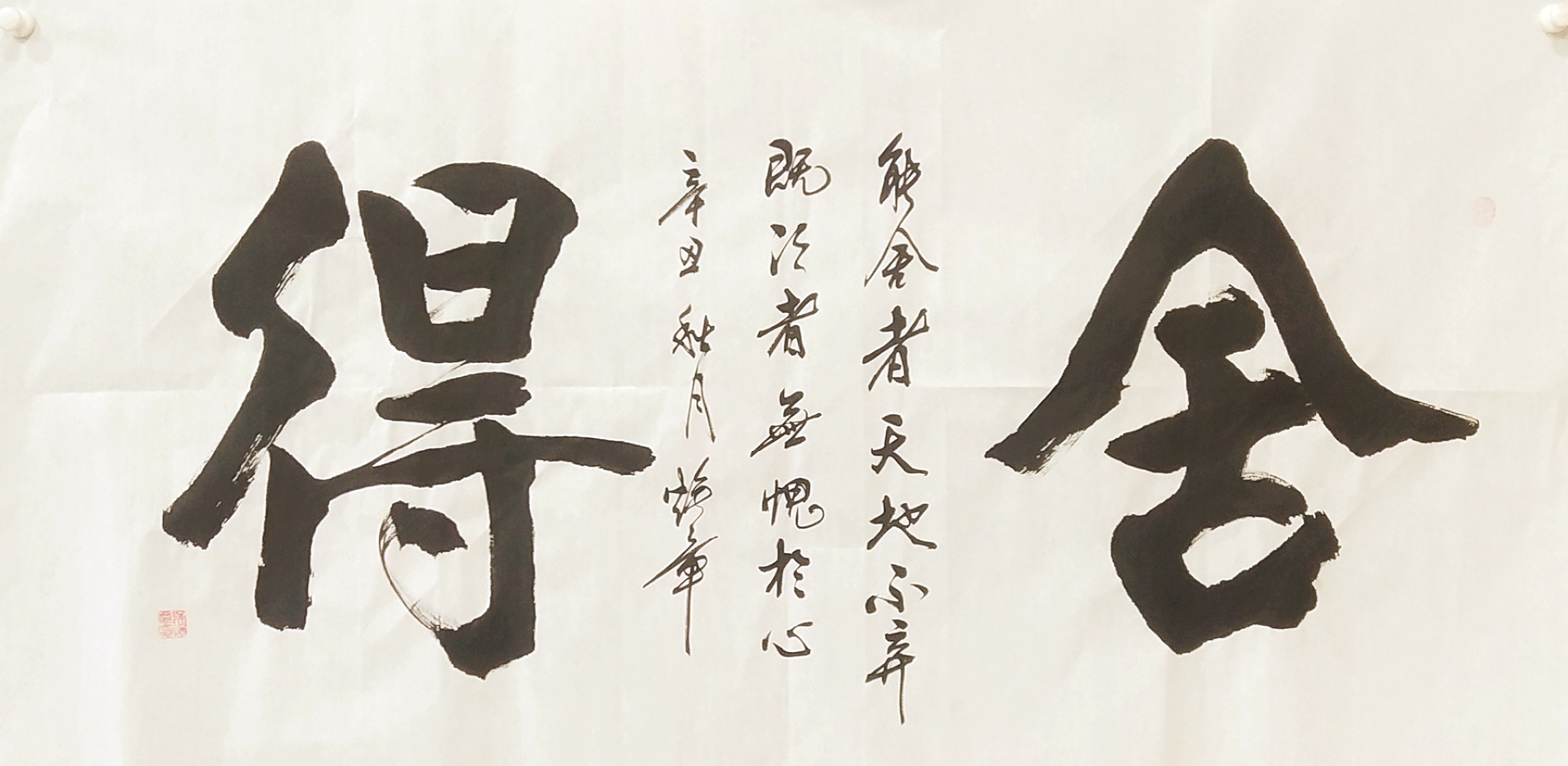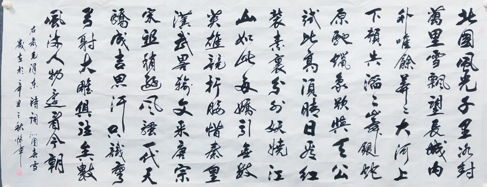 书法的本质属性,事实上是线条塑造为主的真谛,把线条写到游刃有余,就可以面对粉壁长廊数十间,以成刹那之间千万字。吴培玺的字,线条塑造的意识特别强,功夫也特别到位。执笔在于手,运笔在于手,心手相师可以依势而成,作出八面出锋的铺陈!一划之间变起伏于锋杪,一点之内殊衄挫于毫芒!上下翻飞,左右挥洒,在极好的节奏里,把书法线条写得若是万类之象!果然有同自然之妙有,非力运所能成的佳作频频而成。这么强的书法创作能力,绝非匠工而能成,必是入神方可作!