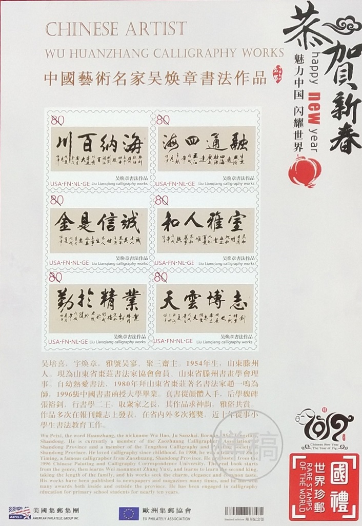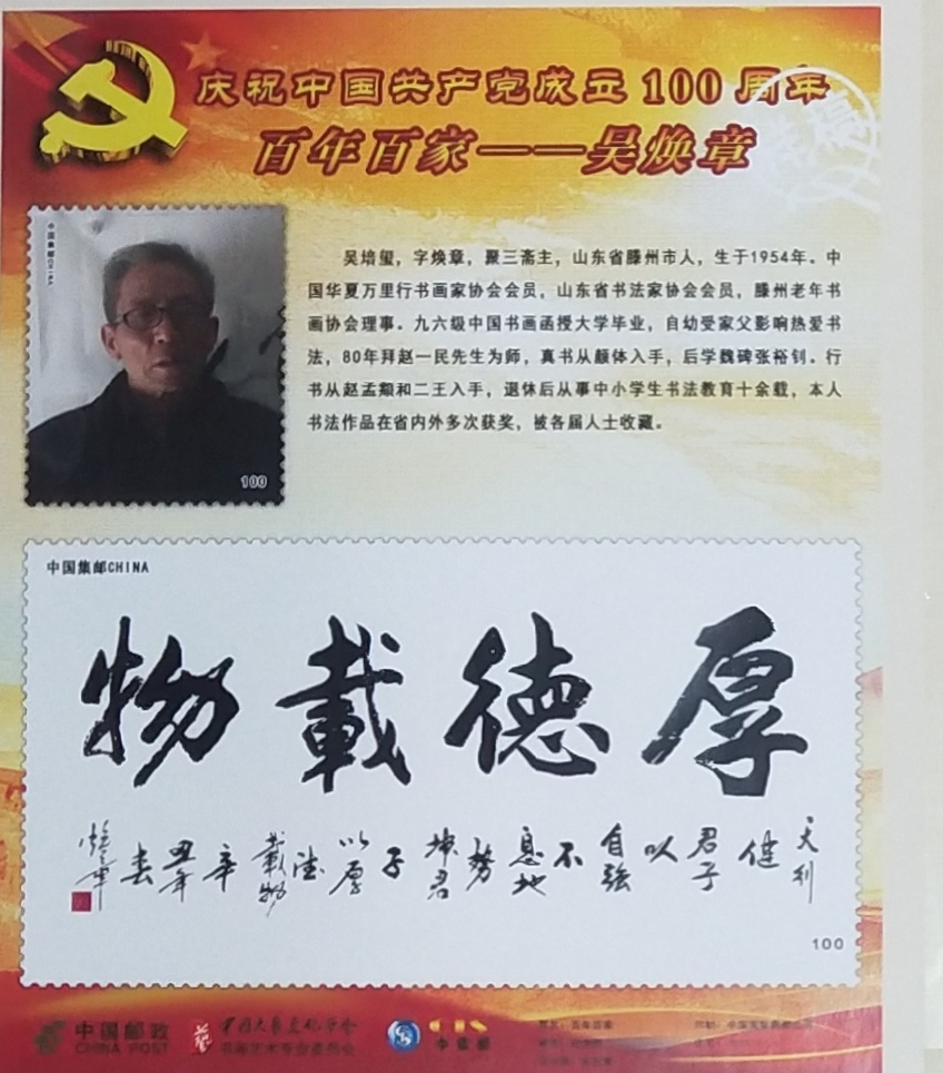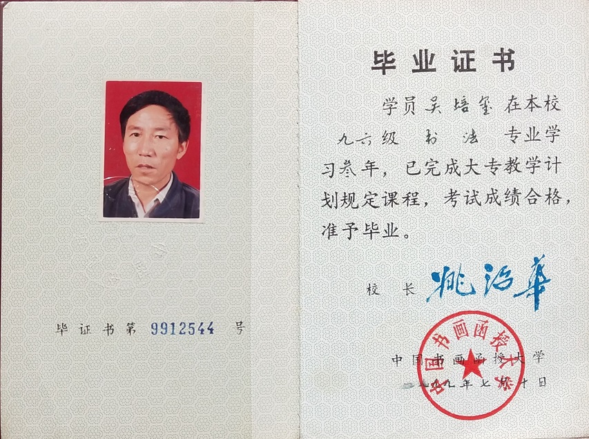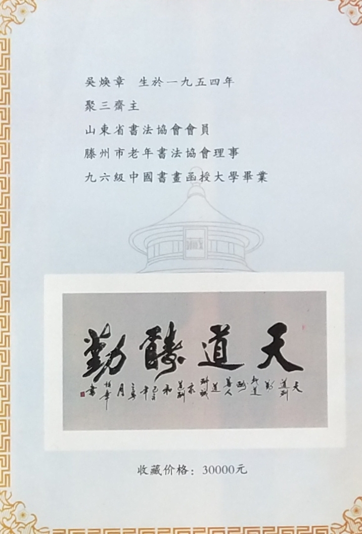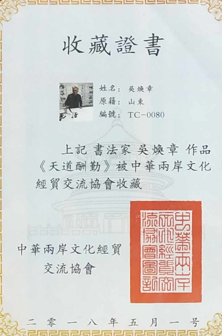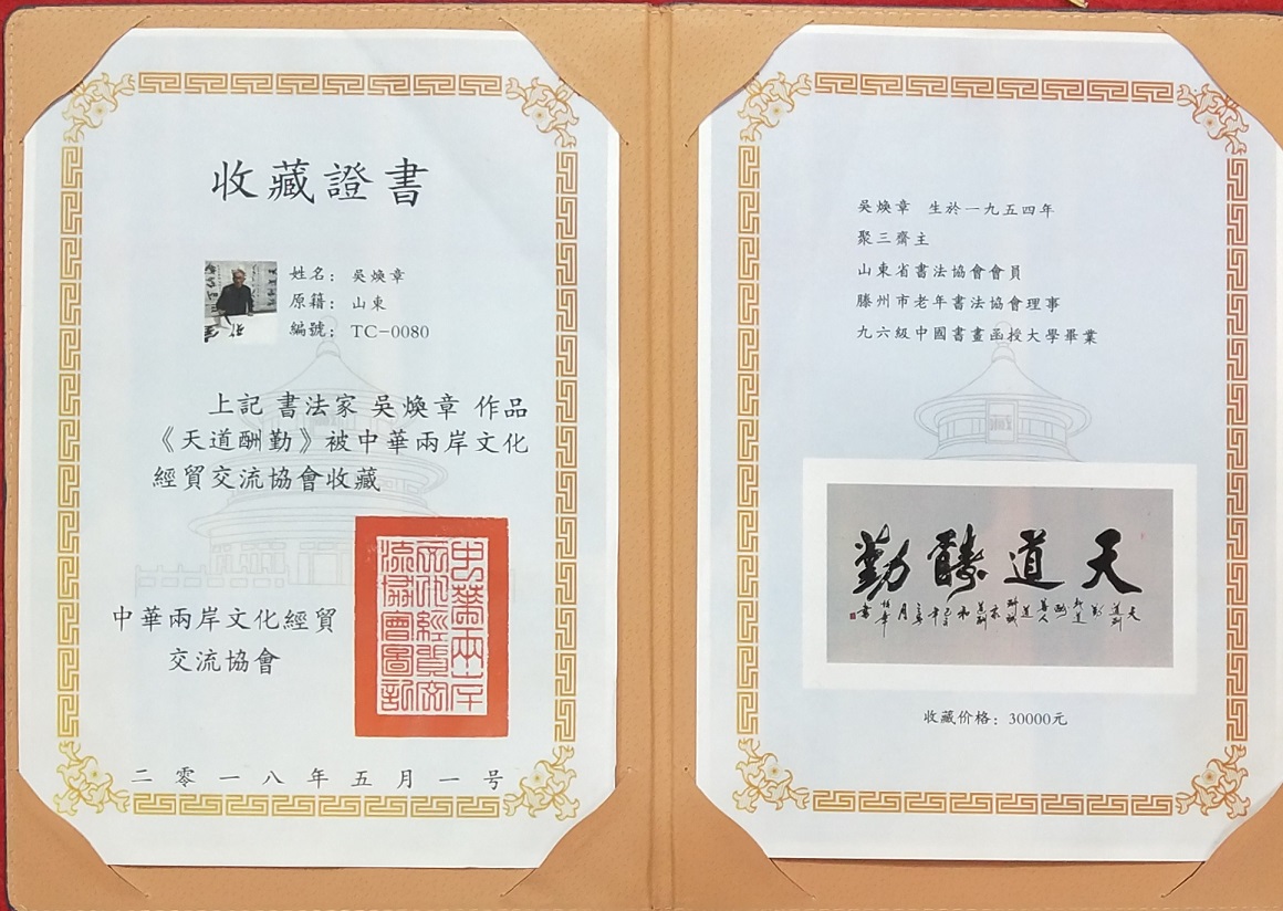 吴培玺,字焕章,聚三斋主,山东滕州人。现为中国书画家协会会员,中国华夏万里行书画家协会会员。山东省书法家协会会员。滕州市书法家协会理事。滕州市老年书画协会理事。八零年拜枣庄著名书法家赵一民先生为师。真书从颜体入手,后学魏碑张裕钊。行书从赵孟頫和二王入手。书法作品被海内外各界知名人士收藏。并在国内外多次获得大奖。九六年毕业于中国书画函授大学。2012年中华颂竹书画大赛一等奖获奖作品,宁静致远。2013年,莲花颂首届中华文化艺术创作大赛作品厚德载物获得一等奖。2014年中国诗书画大赛沁园春雪作品获得金奖。2014年第二届墨缘杯全国书画大赛海纳百川获得金奖。2018年天道酬勤,被中华两岸文化经贸交流大会以3万的价格收藏。