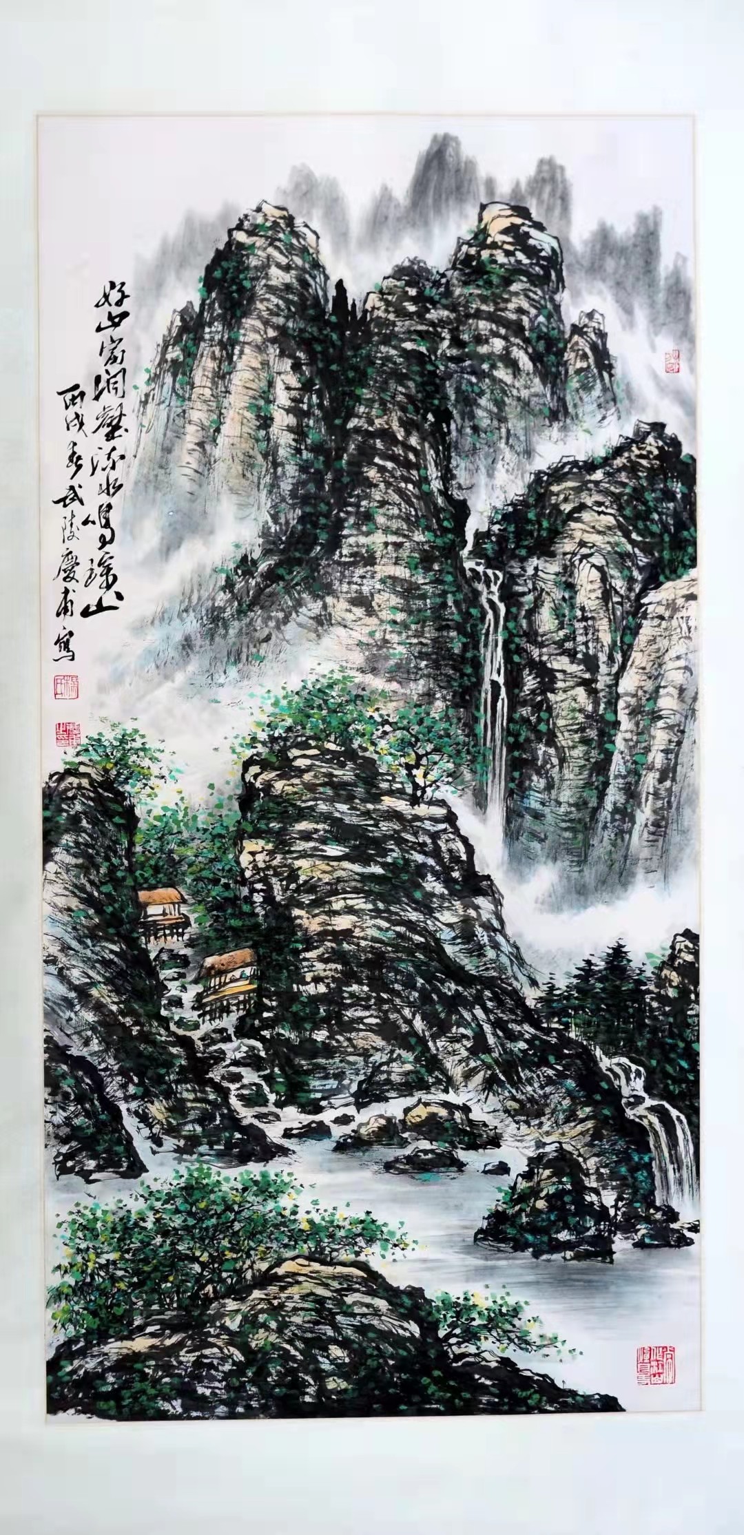 得皴法者得山水之形质,得积墨者得山水之神韵。杨庆甫先生的山水精彩于皴法的丰富与精确,用披麻皴、牛毛、解索、卷云之法把山石的质感擦染到位,虽非真像,却是真质,皴笔立骨,苍雄可观。勾勒线条主显骨法用笔,正向勾与反向勒,进取自如,行如天歌,完全依行天地纹理的动感节奏去行运中锋,山水在笔力的呈发下,生成振奋心绪的精气神。铺陈墨彩,极得智慧,打破了自宋代以来“破墨”一染的单薄,功成清代以来积墨显黑的劲健品格,是龚贤的黑龚高度,也是黄宾虹的黑宾虹之盛观!当代画坛,能积十遍墨黑而显清雅大得苍劲的大手笔,除了杨庆甫别有他人!积墨高手,丹青雄才!