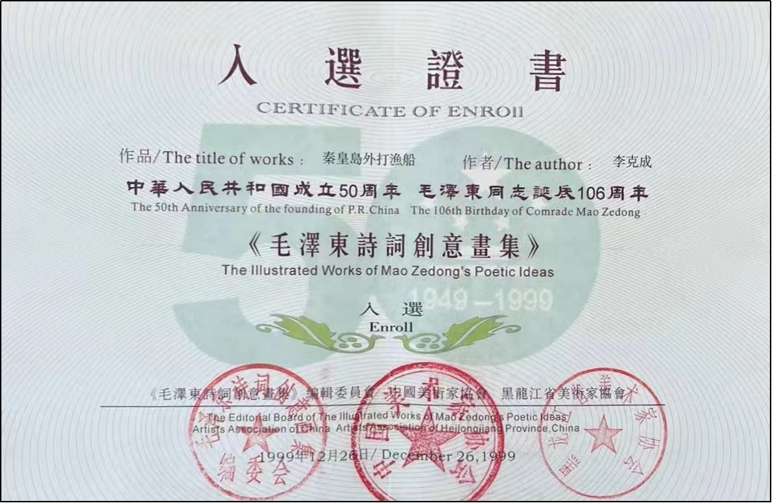 1999年作品《秦皇岛外打渔船》入选建国50周年他同志诞辰106周年《他诗词创意画集》
