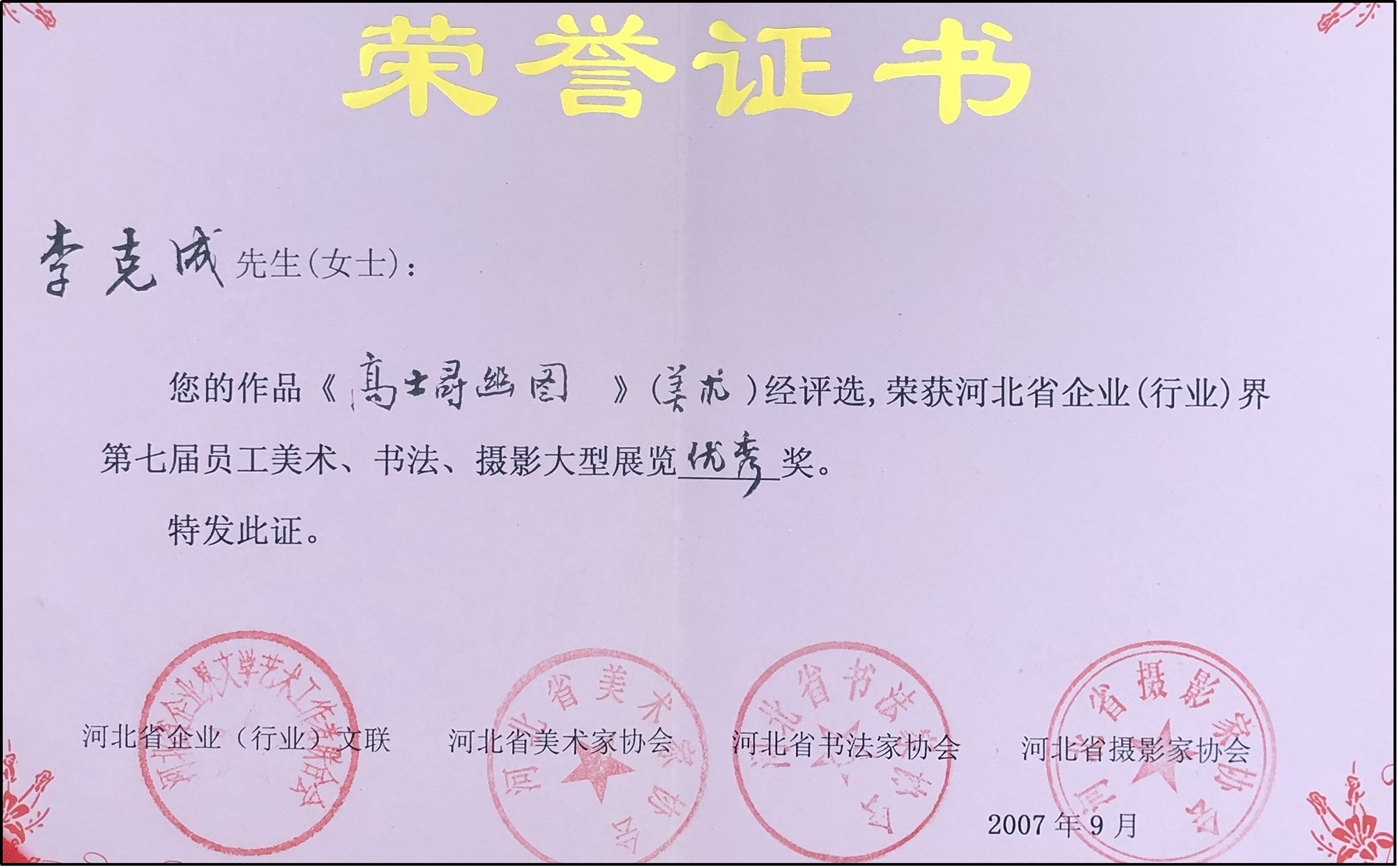 1997年作品荣获第二届职工书画大展二等奖并在中国美术馆展出。