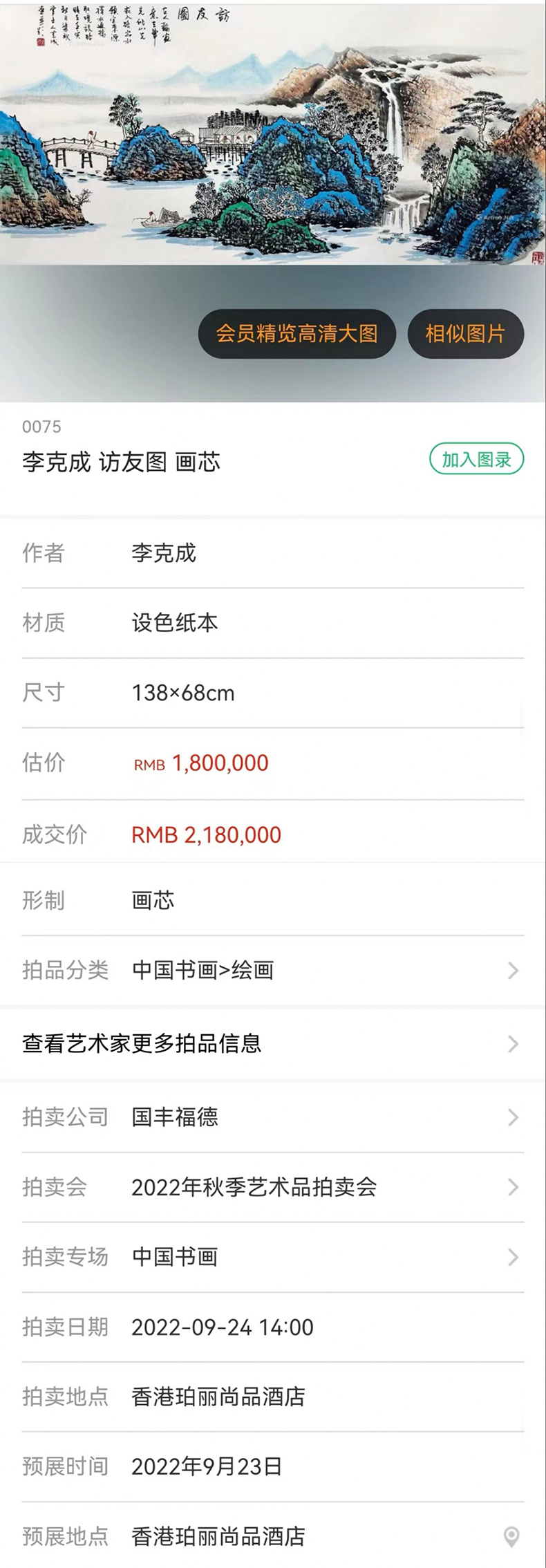2022年在香港秋季艺术品拍卖会上,万山红遍画心,以118万成交。访友图更是以218万,打破自己的拍卖纪录。