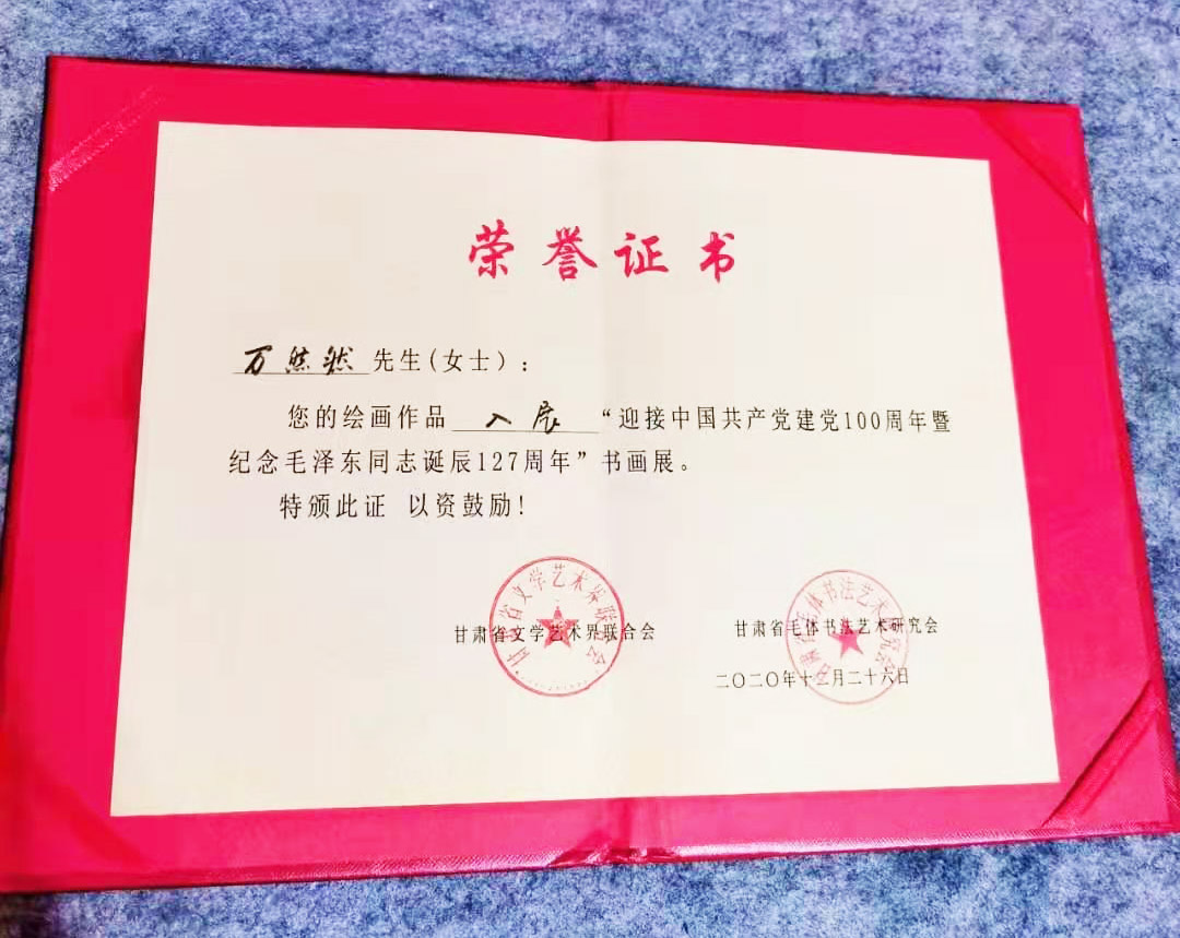 2020年7月20日,在抗疫情.书画行5G直播全国书画展中荣获“爱心书画家”以及2021年12月26日“迎接中国共产党建党100周年暨纪念他同志诞辰127周年”书画展,荣获“荣誉证书”。