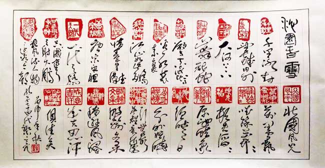 不作雷同,件件都有独特的金石气与书卷气!这是因为他善用草书创作的洒脱影响篆刻气韵。文人写草书,状如落花飞雪,亦如鸾凤徘徊,一划变起伏,一点殊衄挫!观一眼可知先生是书法贤家!这位书法贤家总是可以心控刀法而作印“气”的玄机要妙!天地万物冲气以为活,孔繁亮的篆刻作品依道而成,道法自然,能生得气息,能聚得气象,因气而活,醇古可观,具有勃勃的生命力和鲜明的艺术感染力!刻《沁园春 雪》一印作一句,用意自然,毫不造作,把诗词绝唱赋给寿山田黄,缀而成书,价值连城!亘古作印者,有如此雄才大略者并未曾见!