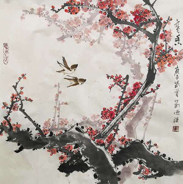 刘德谦是极具个性及潜力的书画家,他的花鸟画以小写意为旨归,寄情花鸟,立意深邃、构图奇巧、笔墨洗炼、讲究韵味,采用老练的绘画功底、奇绝巧妙的构图、技法独具的墨色,描绘出一幅幅气韵生动、赏心悦目的图景,不论是巨幅大画,还是斗方小品,都给人一种脱俗的灵气,真可谓丹青妙手,意趣天成。