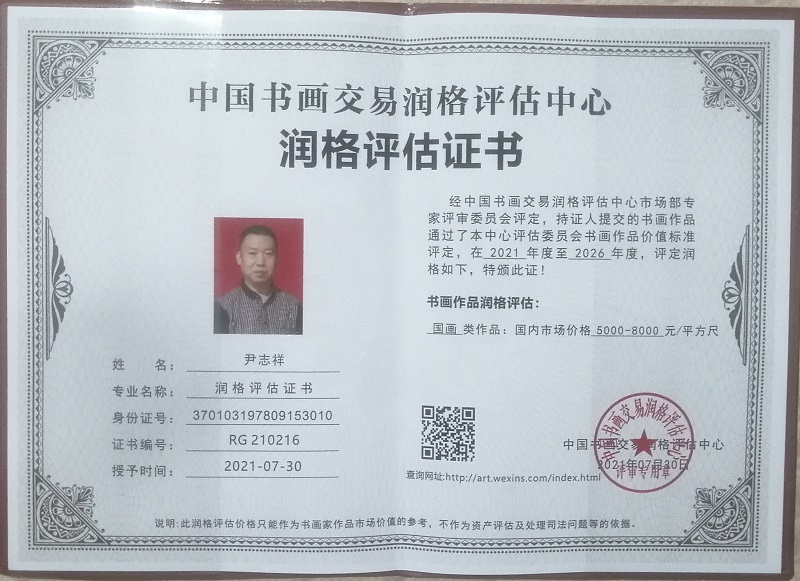 尹志祥 字墨缘,1978年生于山东济南,七零后实力派画家。山东省美术家协会会员,国家一级美术师,现为国学文化研究院副院长,山东省将军书画院理事,新青年书画院特邀画家,济南市文物保护与收藏协会理事,