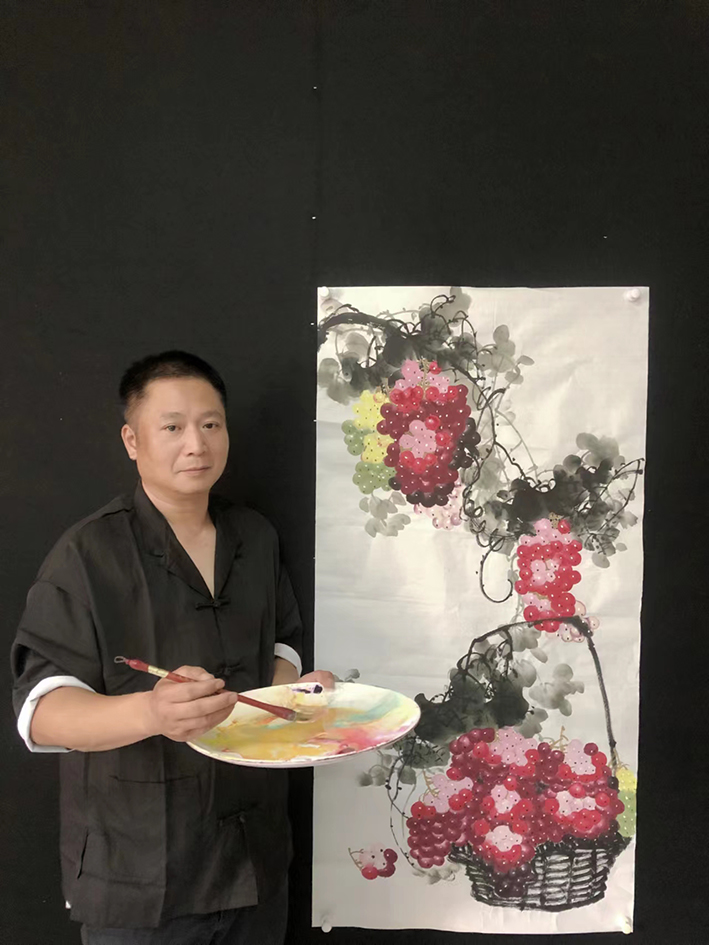 早年师从葡萄泰斗周怀民先生,他笔下的葡萄在美术界号称一绝,素有“周葡萄”的美誉。陈浩老师深得其绘画真谛,花鸟、山水皆能,尤精画葡萄。他笔下的陈式葡萄,结合了传统写意花鸟和工笔葡萄,使得写实兼写意的葡萄颗颗珠圆玉润,气韵生动至极。