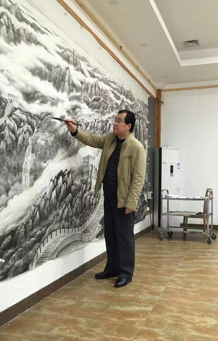 2017年 春节前夕慰问国旗护卫队,赠送作品两幅。作品《雄峙天东》山水画悬挂天安门城楼。;