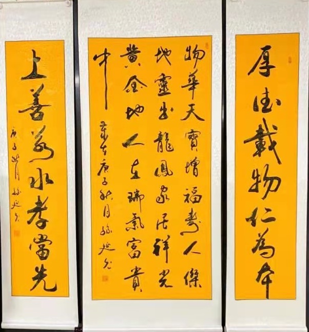 孙延允老师的字,是成年累月的象征,一笔笔铿锵有力。其色,其形,其浓淡枯湿,其断连辗转,粗细藏露皆变数无穷,气象万千。书法里融入了儒家的坚毅,果敢和进取,也蕴涵了老庄的虚淡,散远和沉静闲适,还往往以一种不求丰富变化,在运笔中省去尘世浮华以求空远真味的意味。