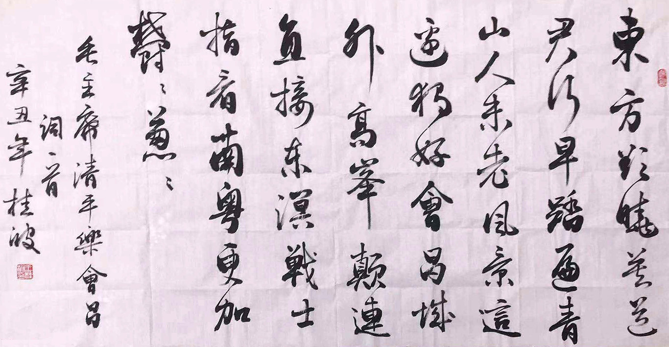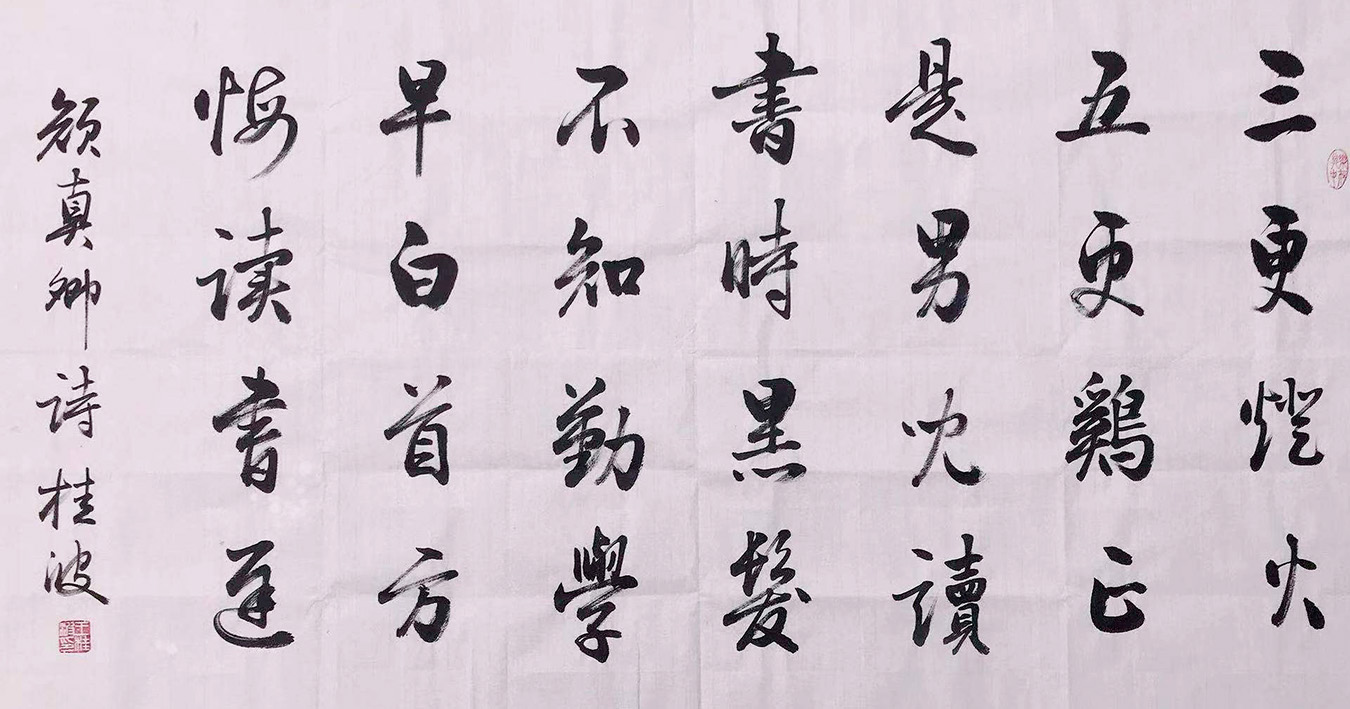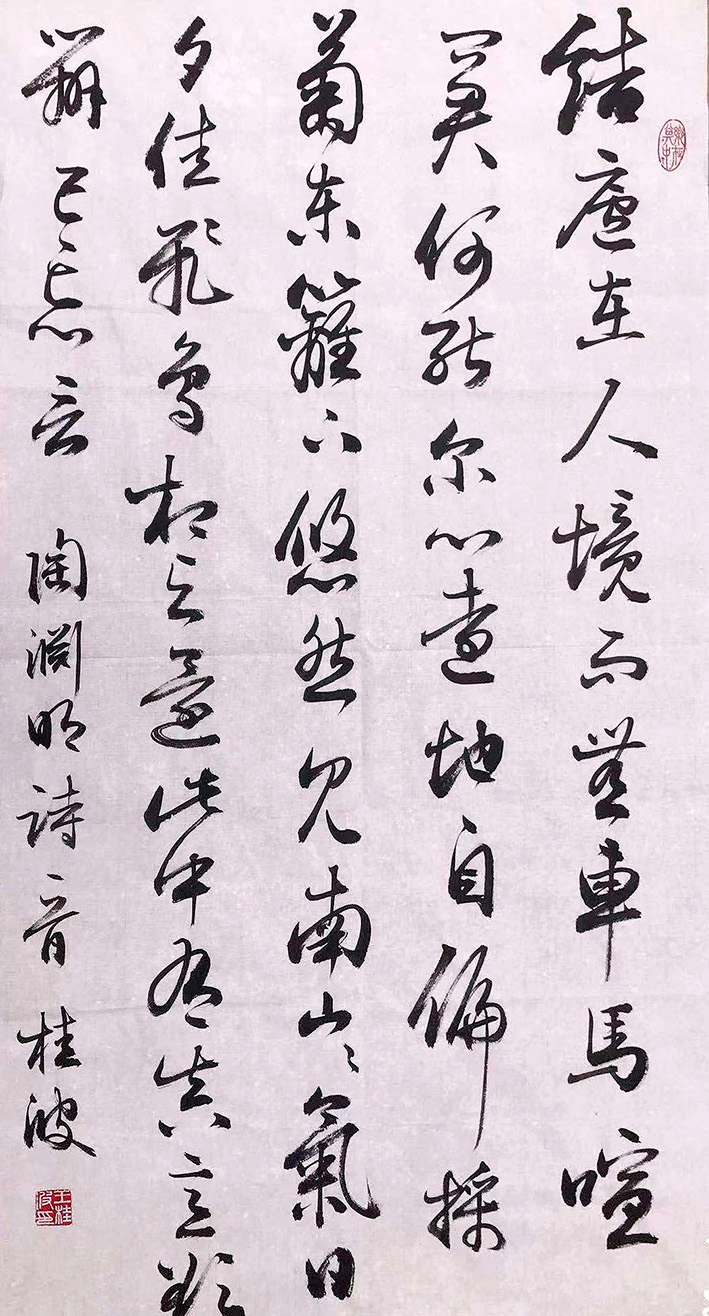 王桂波,山东烟台人。 自幼习字,初习唐楷,后学二王赵孟頫,师从中国资深书法家,一带一路之歌书写者马祝平老师,并在往届书法比赛中多次获奖,现为龙口市书法家协会会员,烟台市书法家协会会员,缘墨书院副院长。