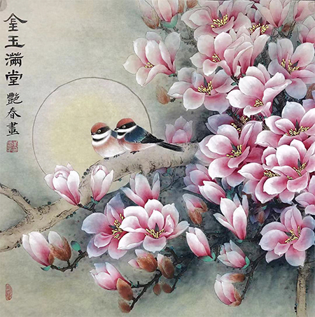 李艳春在难度最大的大写意花鸟画的创作中,表现了前人所没有的饱满精神和充沛感情,实现了传统笔墨意境向现代笔墨构成的转化。在有效强化大写意花鸟画视觉能力的同时,赋予了大写意花鸟画以高亢昂扬又饶于生趣的内在精神。其工笔花鸟遵格而不拘格,追求细腻笔触与水墨意境的完美融合,使画面达到一种浑穆厚重,宁静高古,幽远深邃、清逸高雅的意境。