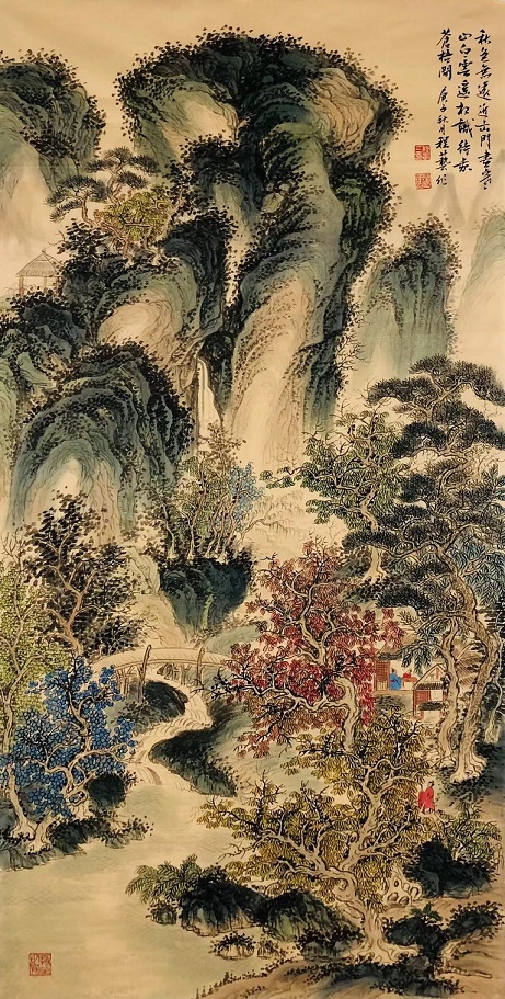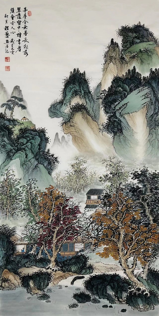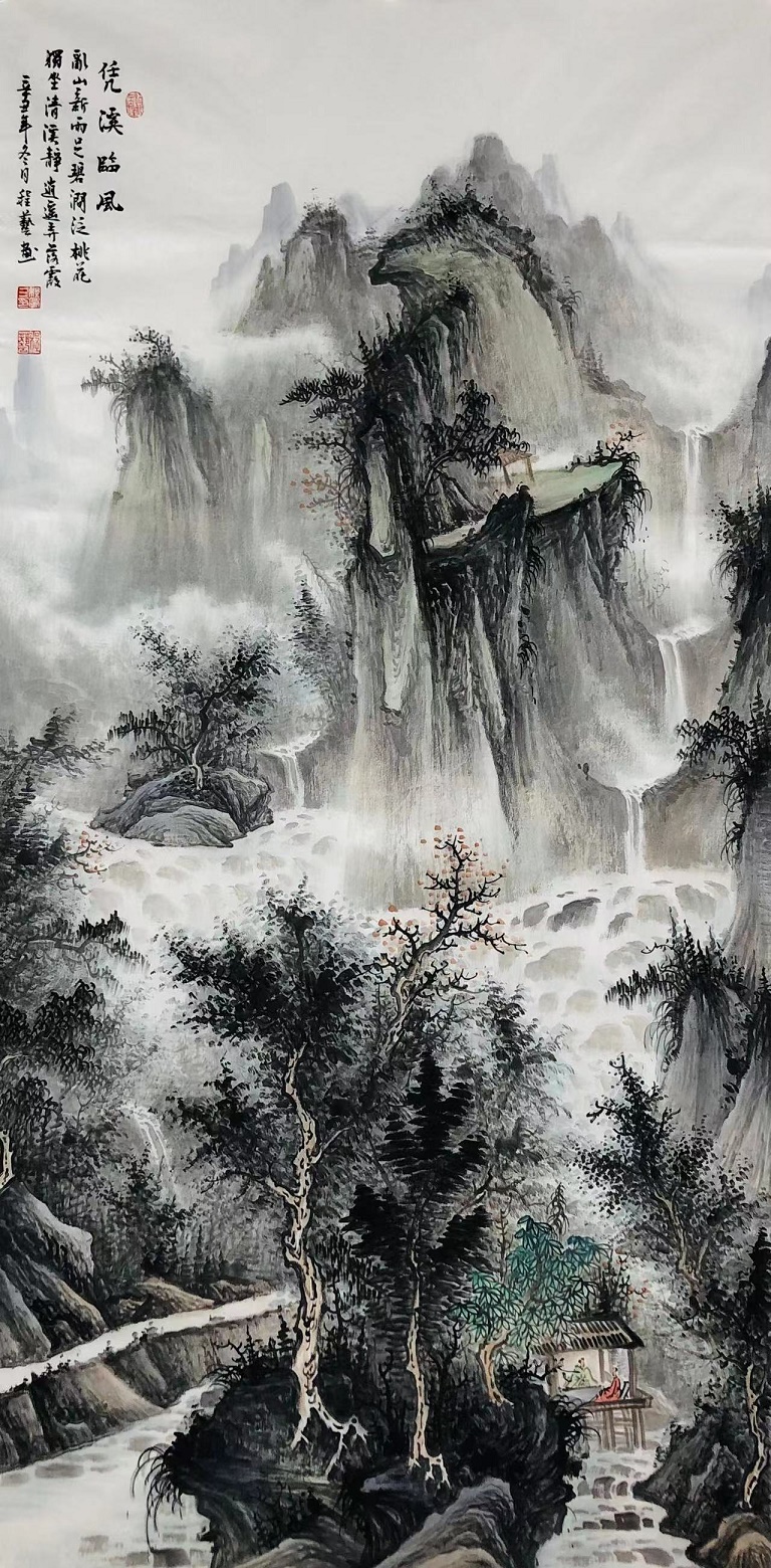 程艺长期坚持美术创作,山水作品立意新颖,境界恢宏,画作,水、色、墨、笔之调是为妙趣。水用得当而使色彩鲜活、丰富灵动;赋色之巧极尽水墨之高雅,隽逸和虚灵,观之活色生香,却不落艳俗;色与墨间神气浑然相生,不觉色倚墨出,墨赋色生;落笔间寓无形为有形,韵致上含蓄而不拘谨,光彩而不华靡,大得幽淡天真之意象。
