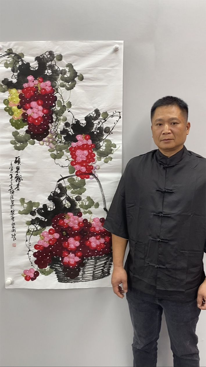 早年师从葡萄泰斗周怀民先生,他笔下的葡萄在美术界号称一绝,素有“周葡萄”的美誉。陈浩老师深得其绘画真谛,花鸟、山水皆能,尤精画葡萄。他笔下的陈式葡萄,结合了传统写意花鸟和工笔葡萄,使得写实兼写意的葡萄颗颗珠圆玉润,气韵生动至极。