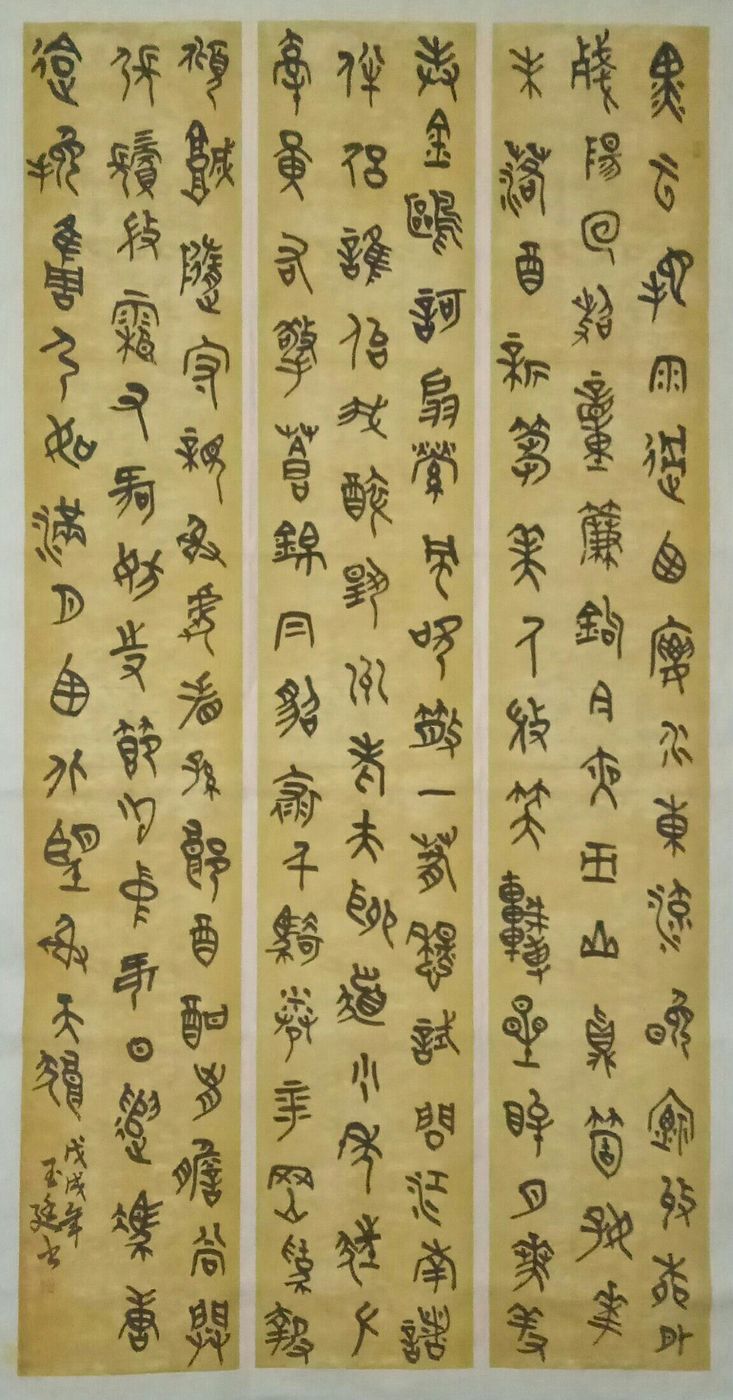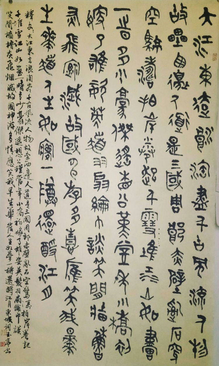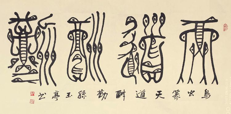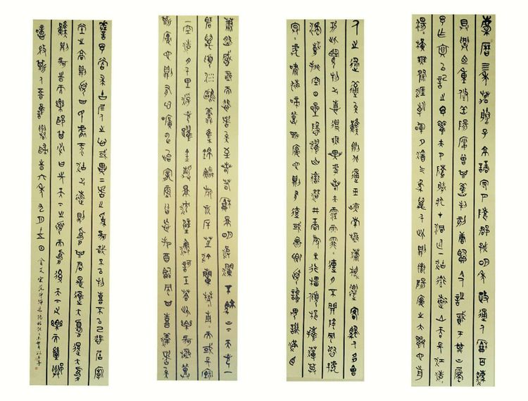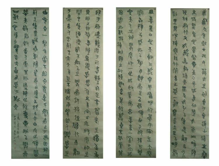 孙玉亭,笔名:大篆人。田润斋主人。78年毕业于山东省轻工美术学院。 授教于: 李刚田、言恭达、高庆春、刘京闻、张世刚、王学岭、李守银、倪和军诸位老师。行书师承二王。潜心研究大篆甲骨文、金文、石鼓文数十年,袭古创今,形成刚柔相济的大篆风格。