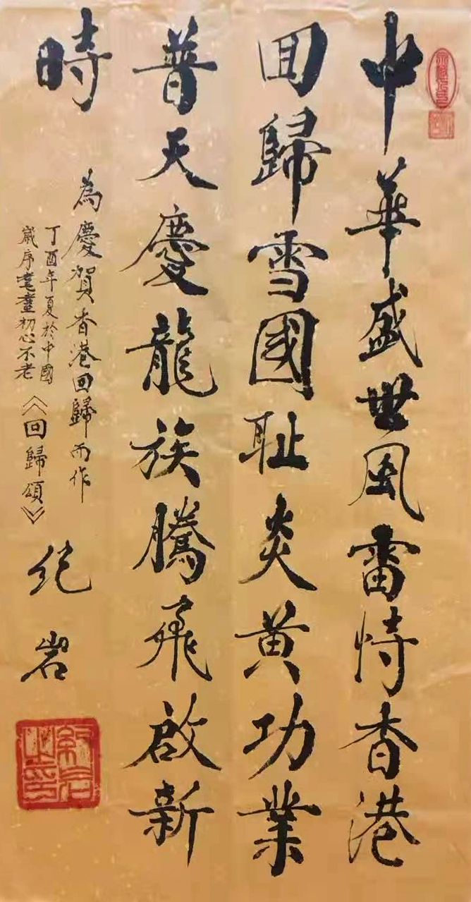 名家点评;吴惠良(当代文化名人)点评:纪岩,国家一级书法师,系中国当代书法家,“写广大人民群众喜欢的作品,做对人民益的事情,”是纪岩老师信守创作原则。纪岩的书法创作注重时代旋律与人民精神需求的表达,内心始终被浓烈的爱国爱民激情所充满,非常注重习碑临贴,通过自己的思考与艺术探索实践,对书法的传统框架与书写范式加以突破,以实现自己在书法艺术上独特的创造与表达。甄杰书法结体气势开张,同时又新奇而有韵致。在粗与细,虚与实之间,呈现出的是彼此的关联与笔势上的呼应。 多年来,纪岩的书法深入传统、潜心修练、充实综合素养,融汇百家、自成一体。“传统筑根基,胆识铸书魂”,突出个性、打造品牌。“笔墨藏功底,章法展才情”。作品崇尚北派书风、金石气韵、阳刚之美;特点追求:大气、雄浑、厚重、古拙、苍茫、老辣。作品结体方正、茂密,笔画横轻竖重。笔力雄强圆厚,气势磅礴,每幅书法作品都闪耀艺术的光芒,甚称精品具有收藏价值和欣赏价值。