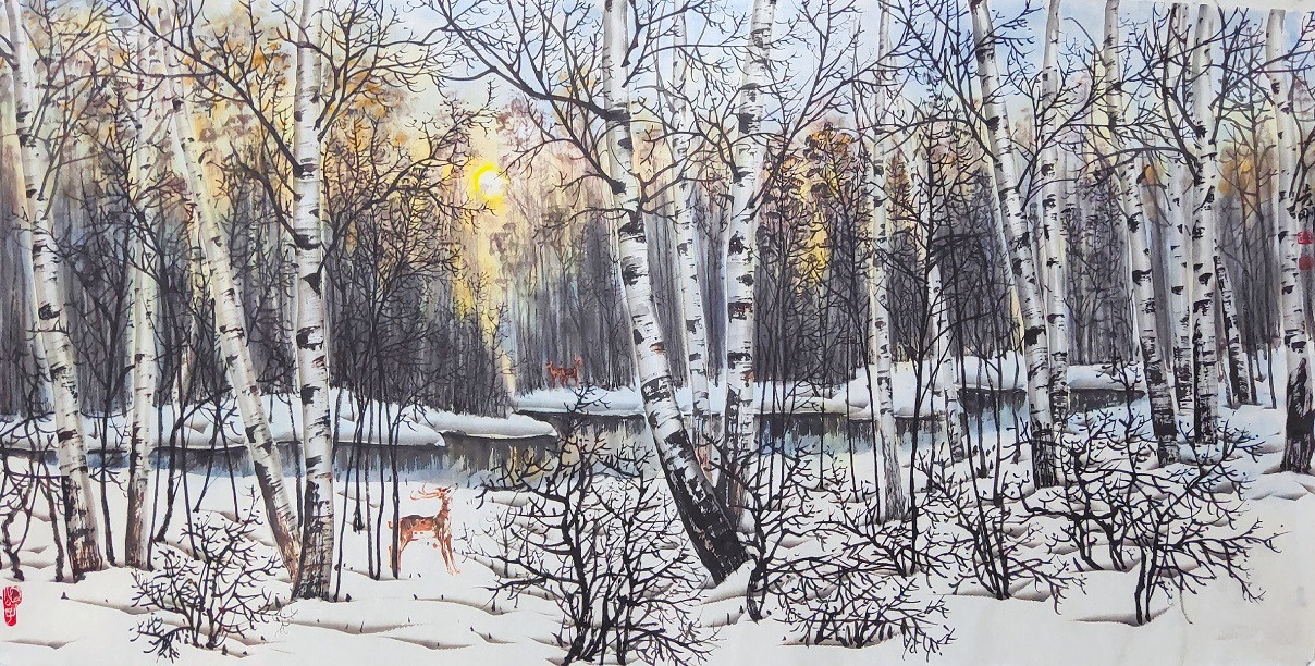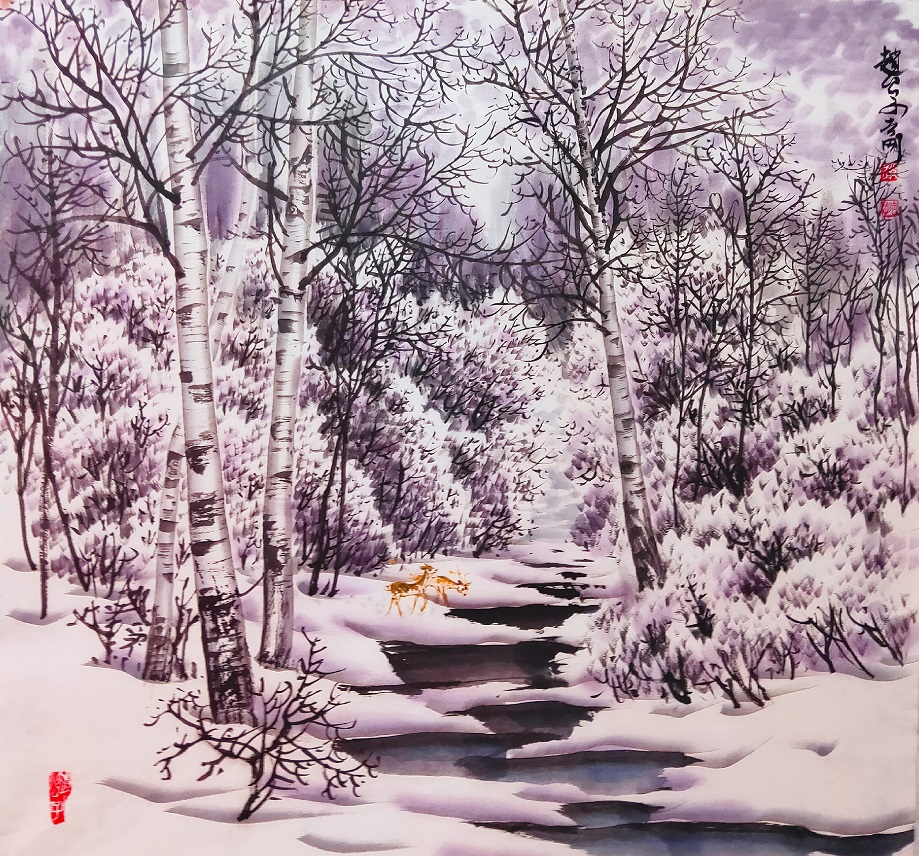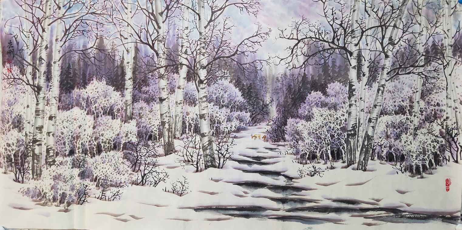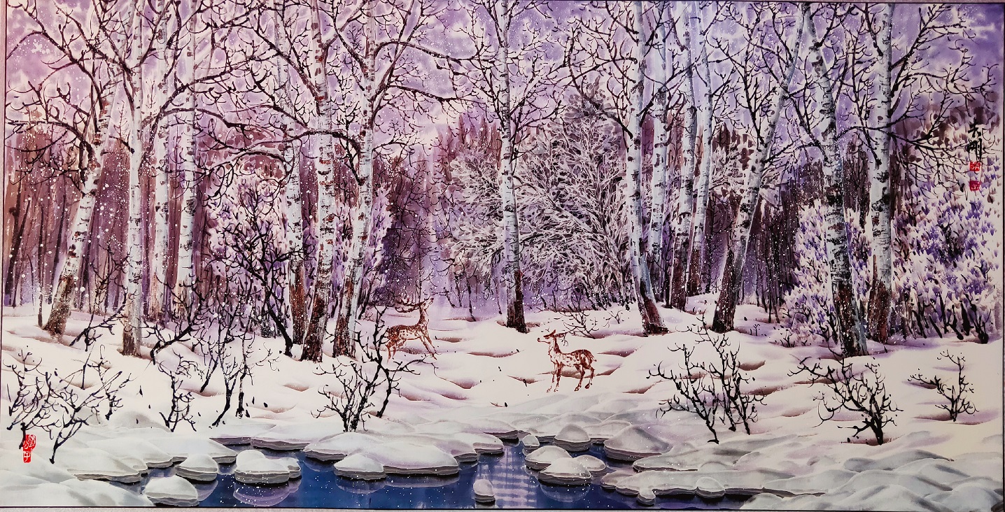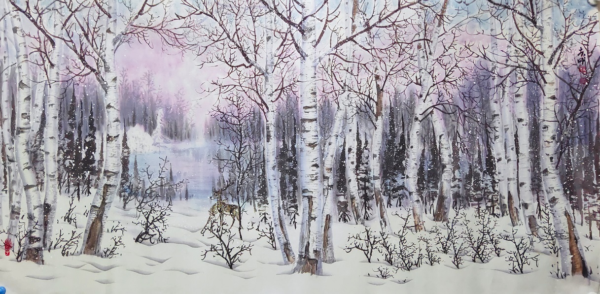 其作品场面宏大,色泽艳而不俗,构图严谨笔法细腻洒脱,层次分明,画面柔和的恰到好处,给人一种自然清新、身临其境的感觉,在创作技法上做了大胆尝试,为充分表现大自然的气象万千,不拘于任何一种传统技法,讲究笔墨基础上运用了多种技法使人眼前一亮的视觉冲击力,作品被大量海内外书画爱好者收藏,被人们誉为冰雪画传播的使者,白桦王子称号当代实力派画家。