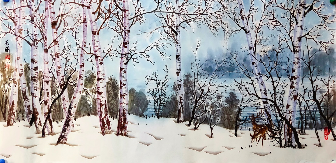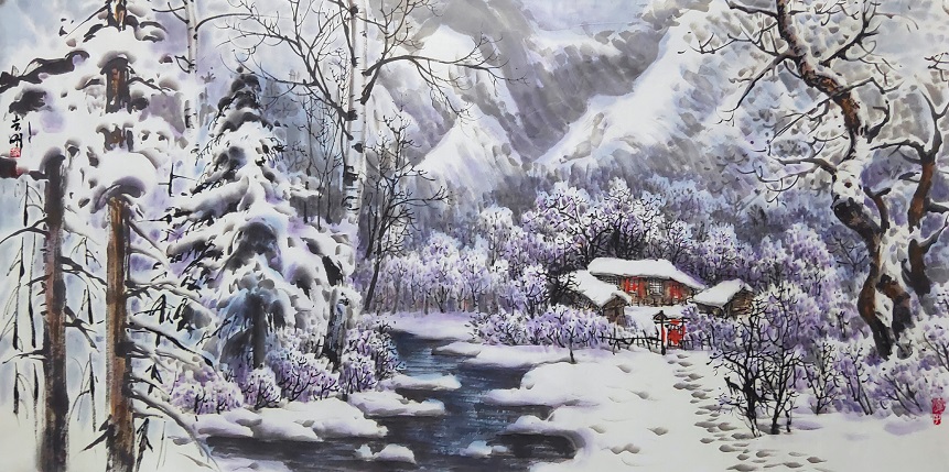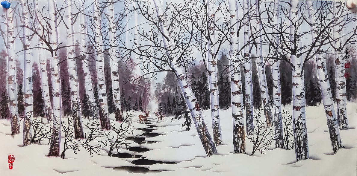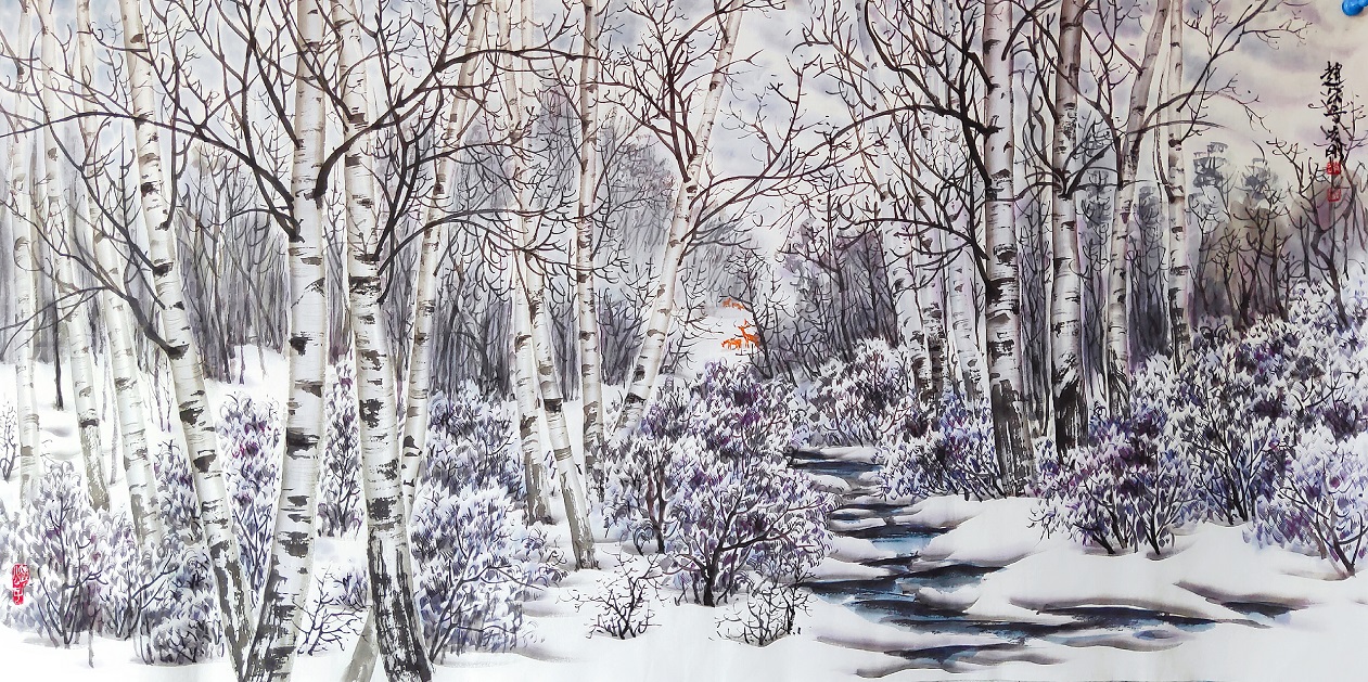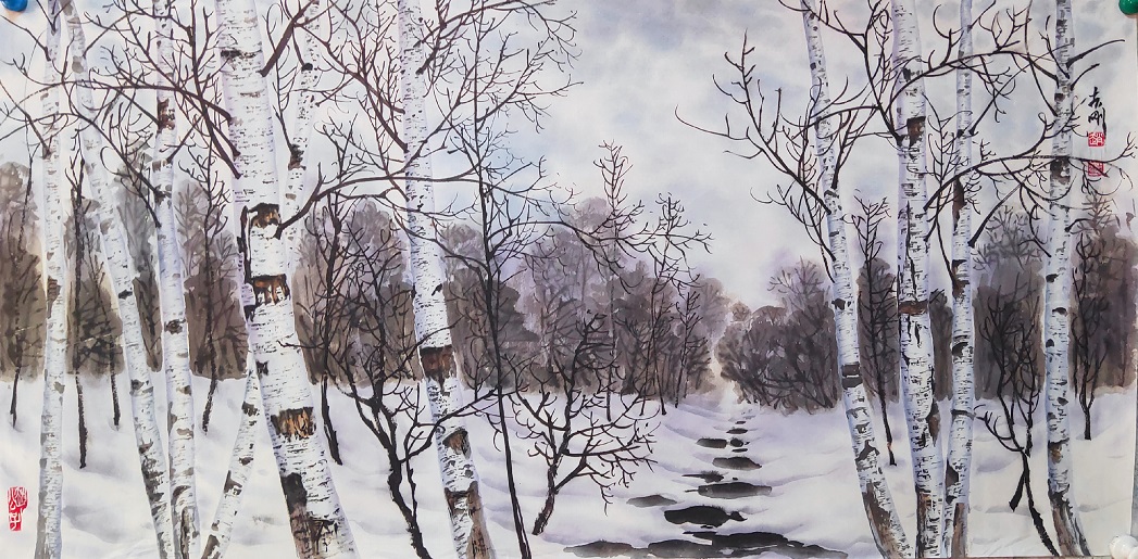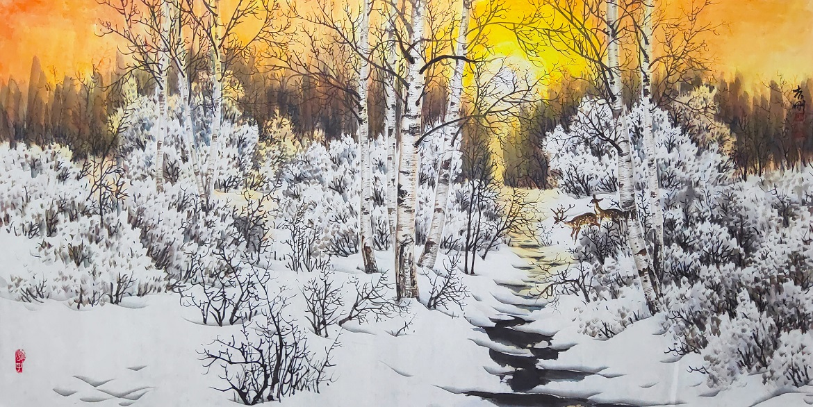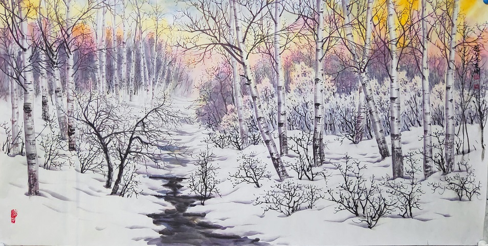 其作品场面宏大,色泽艳而不俗,构图严谨笔法细腻洒脱,层次分明,画面柔和的恰到好处,给人一种自然清新、身临其境的感觉,在创作技法上做了大胆尝试,为充分表现大自然的气象万千,不拘于任何一种传统技法,讲究笔墨基础上运用了多种技法使人眼前一亮的视觉冲击力,作品被大量海内外书画爱好者收藏,被人们誉为冰雪画传播的使者,白桦王子称号当代实力派画家。
