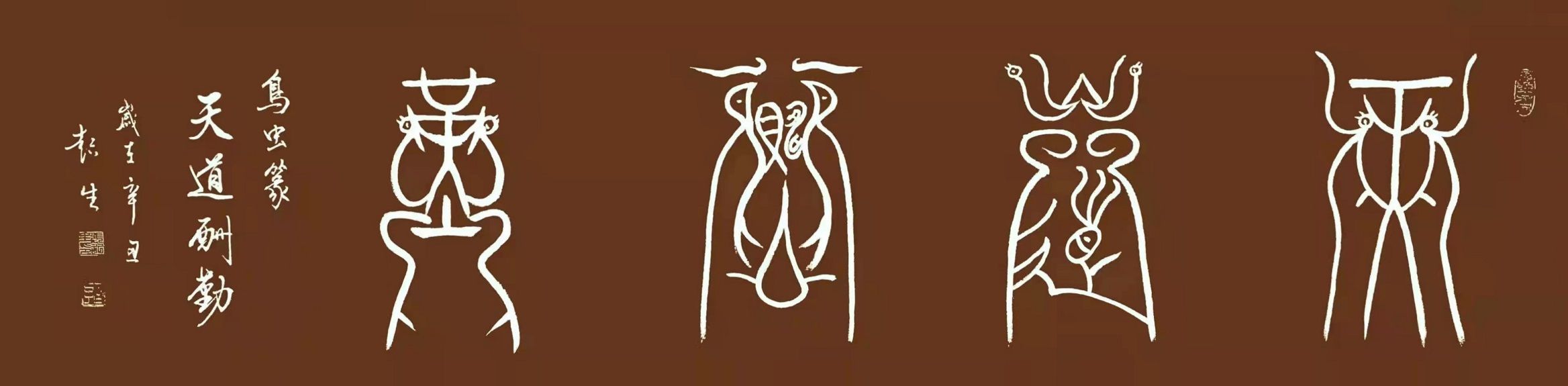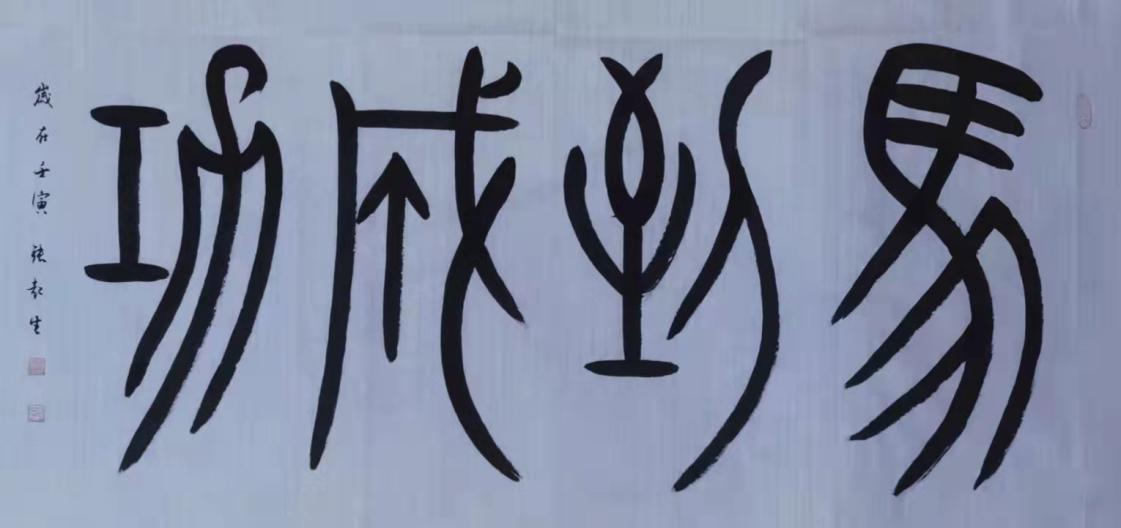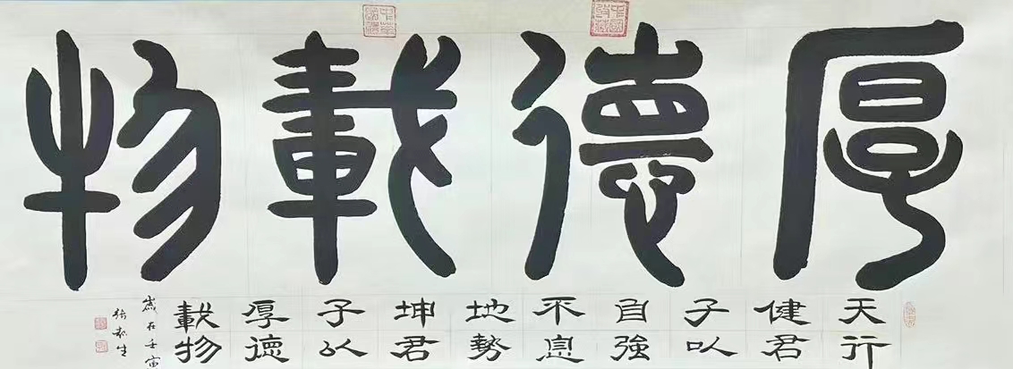 鸟虫篆《天道酬勤》,2015年,在中国美术馆入展全国书法名家展参展作品,同年与苏士澍一同赴日本参展,此作品轰动日本汉字文博界,2016年同款墨宝被著名影星成龙以55万收藏;
