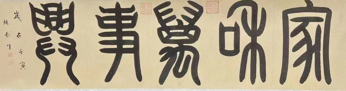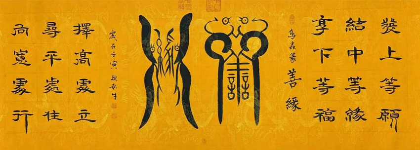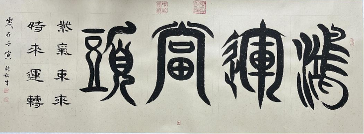篆书《鸿运当头》,“梦回秦汉”个人展连续3年入展作品,于2013年新加坡中华书学会馈赠给新加坡国立大学的墨宝,此墨宝被知名舞蹈家杨丽萍以45万收藏;