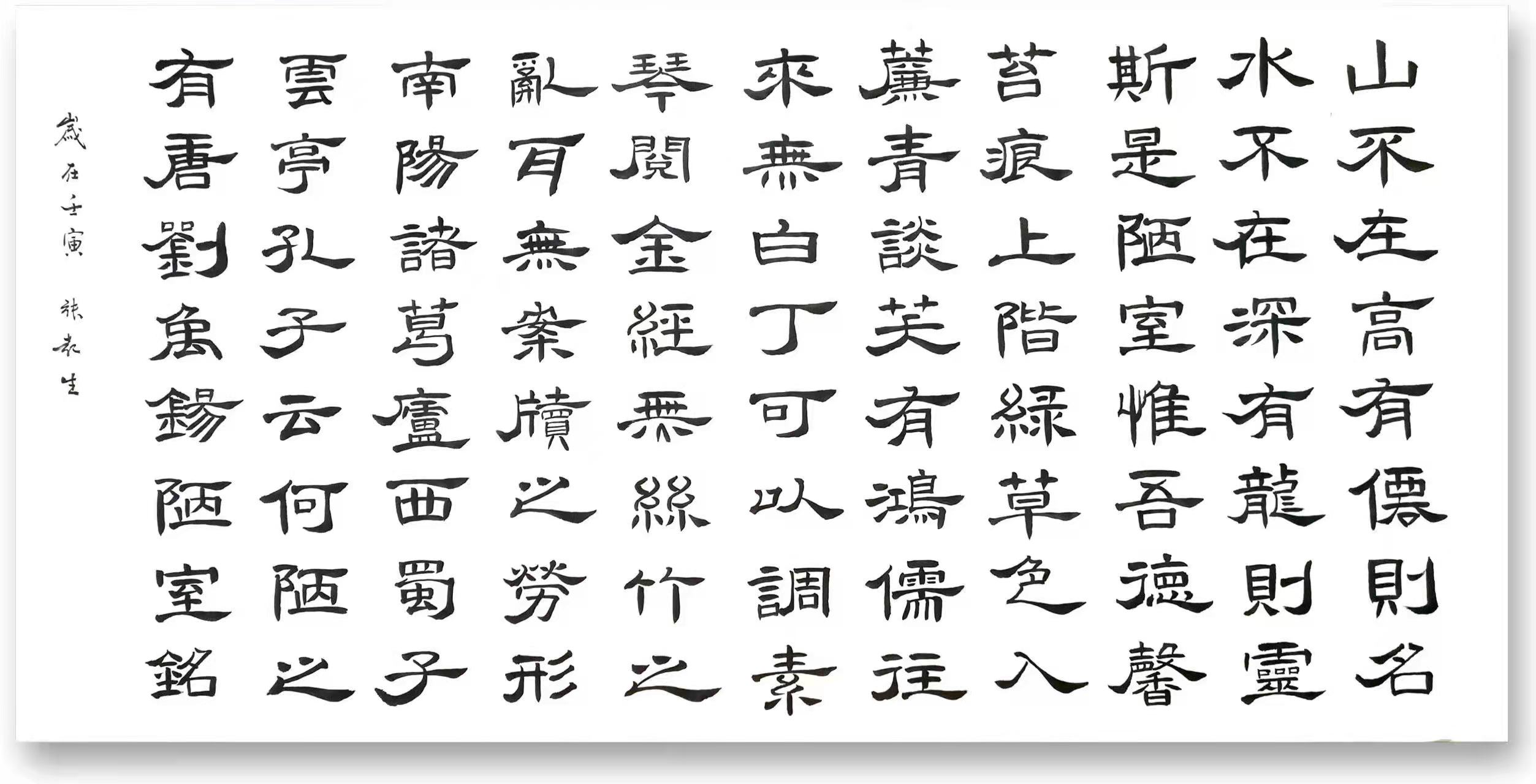 隶书《陋室铭》,2020年第六届三十省市中老年书画大赛一等奖,2021年全国精品书画大赛金奖,同年此作品被杭州苏东坡博物馆收藏。