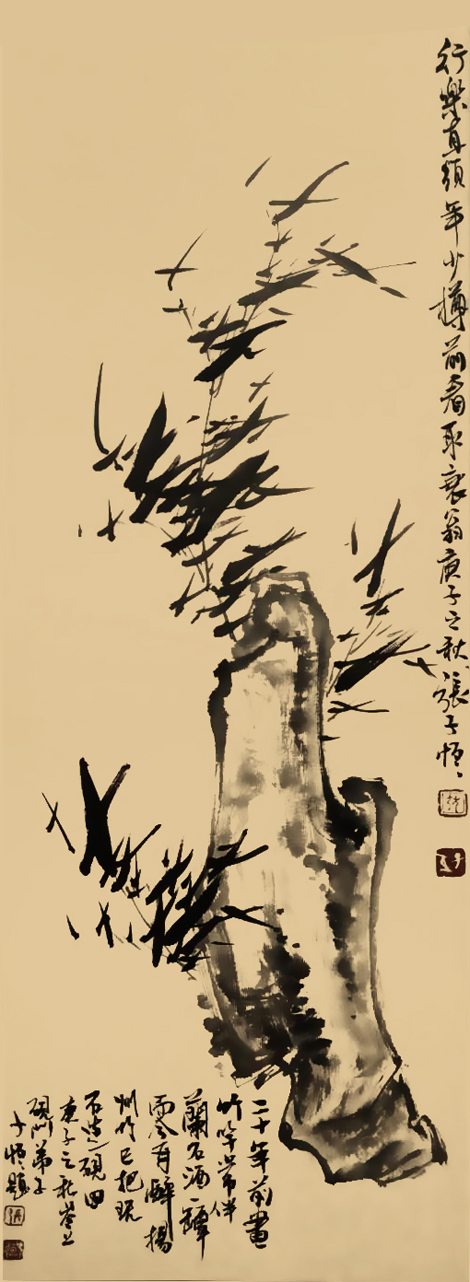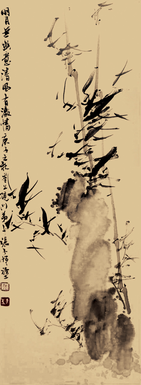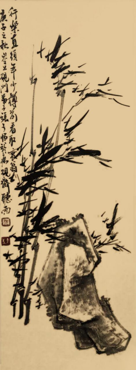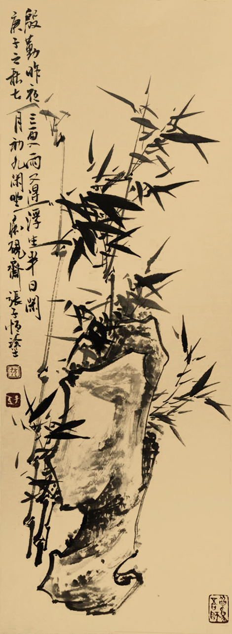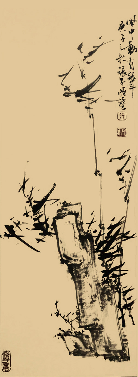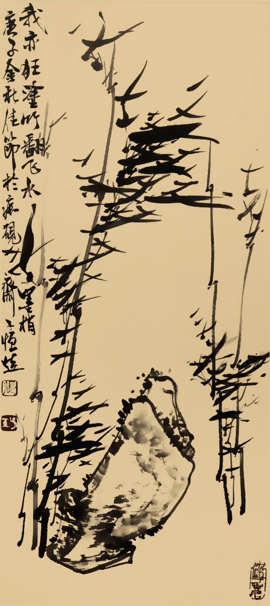 作品以大写意风竹的成就最为突出,主要用“金错刀法”,直落中锋,劲如刻铁,并且其竹叶的组合也并不求“个”字、“介”字,而是一挥而就。作品气度在浑,风貌在拙,魂魄在雄,笔下豪迈跌宕,畅快淋漓。