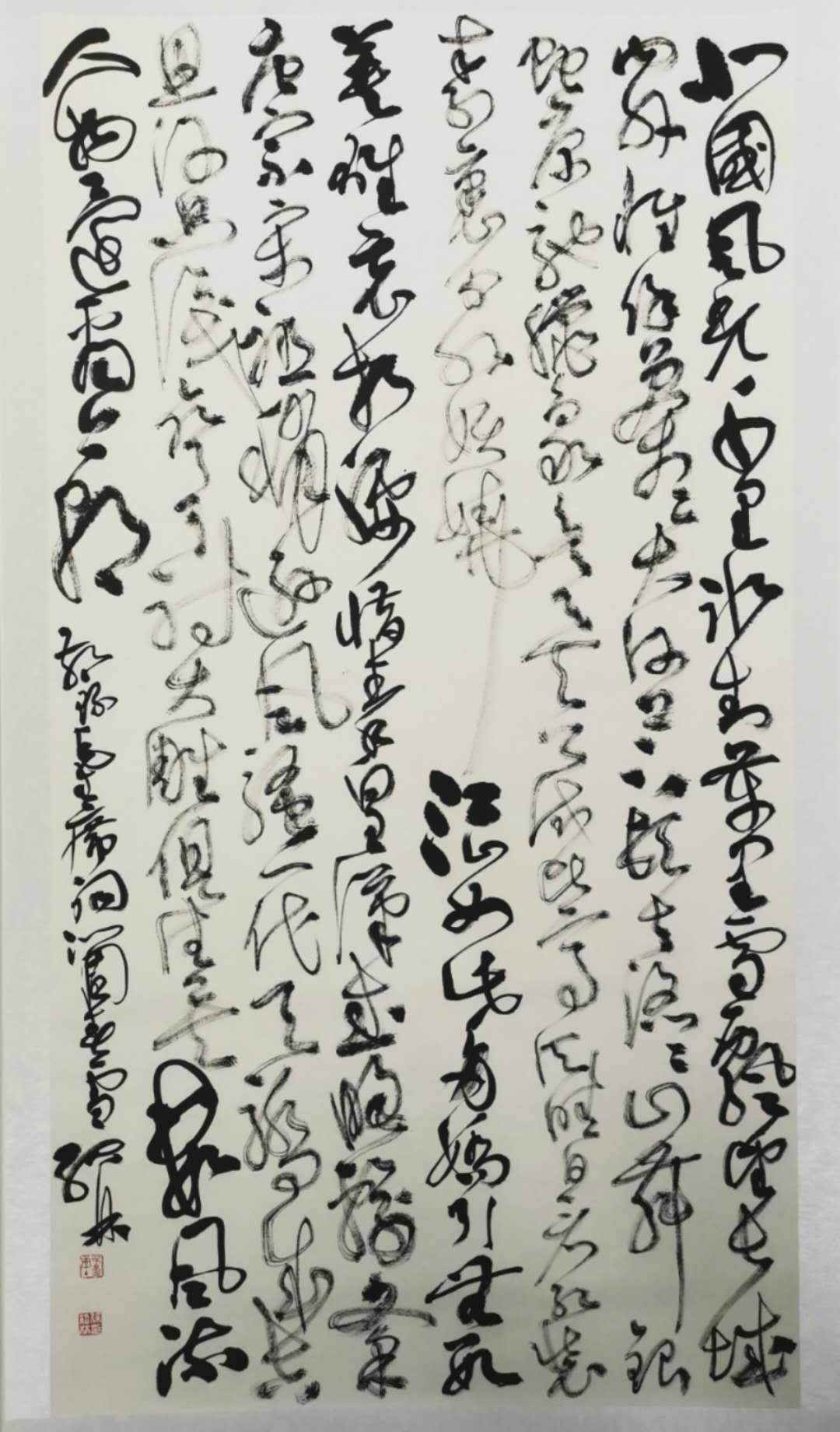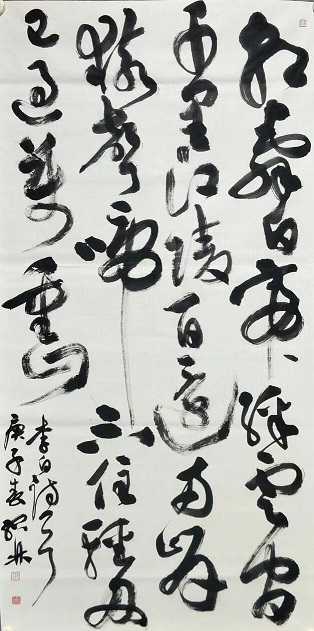 三十年前,他由唐楷颜真卿《多宝塔》、《勤礼碑》,柳公权《玄秘塔》、《神策军碑》入门,行书入手习王羲之《兰亭序》、《圣教序》。遍临二王行草书手札刻帖及苏、黄、米、蔡宋四家。草书除二王之外,深研孙过庭《书谱》、智永《草书千字文》、《大观帖》、怀素《自序帖》、张旭《古诗四帖》及王铎、傅山草书墨迹。