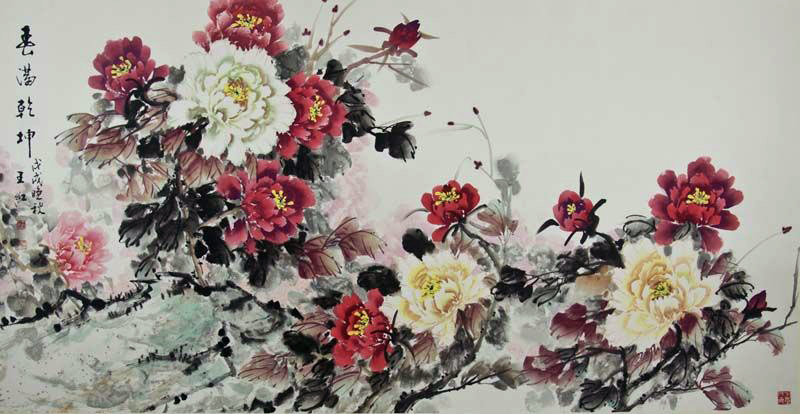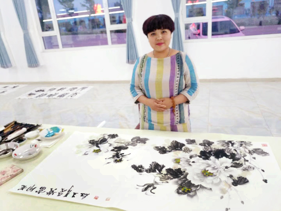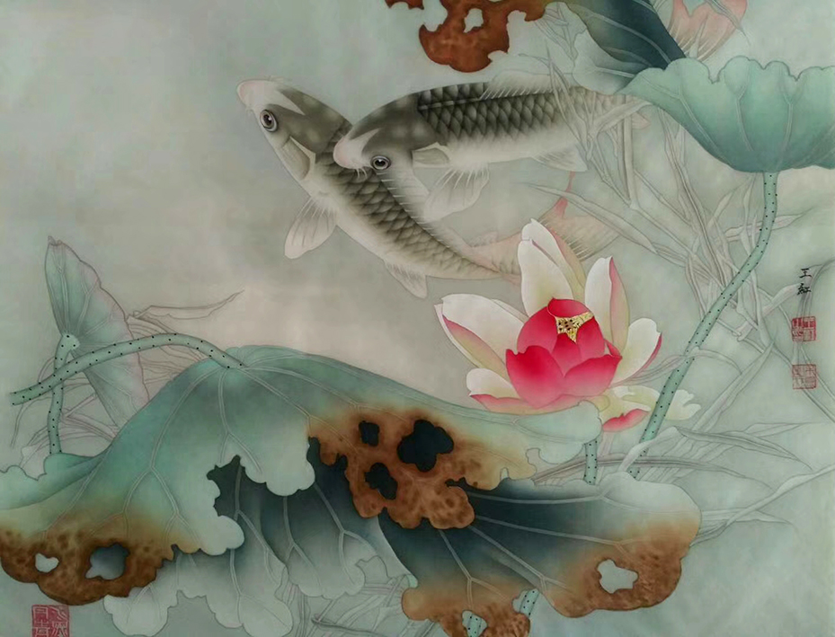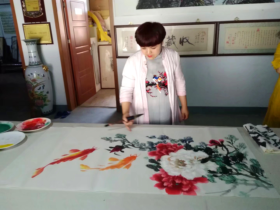 她创作的牡丹花缤纷艳丽,红的如火如荼,粉的娇柔婀娜,白的一尘不染。画面唯美、让人陶醉,作品色墨结合,笔墨遒劲,在传统基础上力主创新,美的流光溢彩,把富贵满堂的画面表现得灵动富有生机。她画锦鱼图构思巧妙,含太极之哲理,鱼儿形态灵动,身姿曼妙、寓意祥和、色彩相和、情随意动、气运天成。