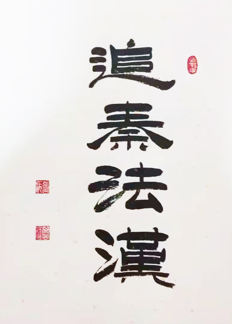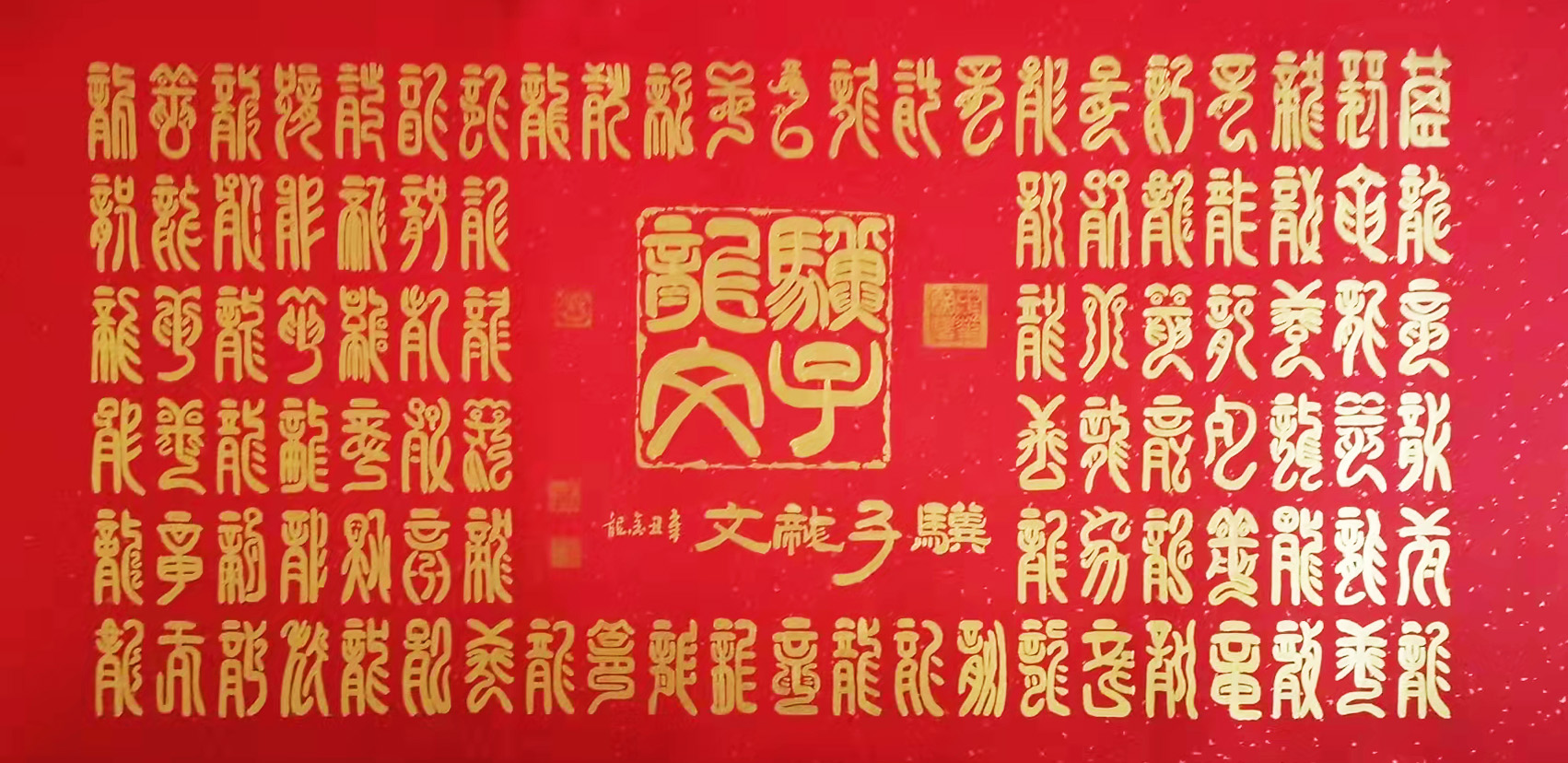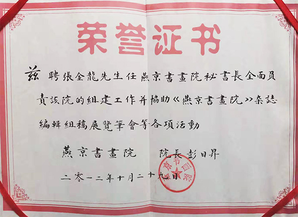 人称京城三大怪才张金龙。他在书法艺术海洋里畅游天下,在数十年里创作出大量的书法作品,在北京乃至全国引起了很大反响,被公认为当代篆书的领军人物。张金龙自幼酷爱书法艺术,主攻行书,隶书,篆书。被人们称之为“京城三大怪才”他在创作创新方面总是新持神往大搏大雅,出新不断。曾拜故宫博物院彭淼教授为入室弟子。先后临习张迁碑乙瑛碑石门颂等古法字帖。其人得八法之功,一家天马之神,尔后用笔抉石于书法中,挥毫泼墨笔走京城,锦囊之绝妙,脑神之功字字体现在创作之灵感,震动华夏。后又从师于中国人民解放军总后勤部赵永良将军临习篆书。先后临习李斯李阳冰字帖。他有着优秀传统的书法理论基础,深厚良好的汉字书法功底,广识博学的综合文化素质,刻苦认真的与时创新精神,这便是他的书法艺术有了灵气和生命力。综观他的书法作品,使人感到新而不薄,华而不媚,成篇作品不失法度,少字作品也不失大器、刚柔相济、雄秀并举、血肉丰满、结构天成。师古而不泥古,求新而不取宠,此乃“众多古人铸于心,予以笔,集百家之长,融于他自己”。他真、草、隶、篆皆能,但最擅长的是篆书。在那流动的线条中,方圆、疏密、大小、长短、粗细、浓淡、枯湿、多变灵活,大气磅礴,如行云流水。他的艺术魅力不仅仅给人以艺术欣赏,而且给人以精神享受,形成了自己别具一格的艺术表现形式。