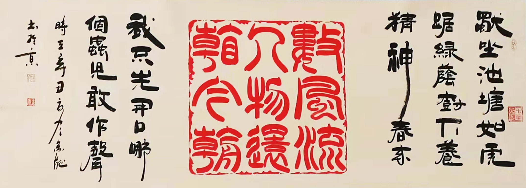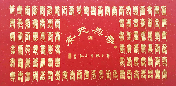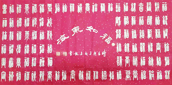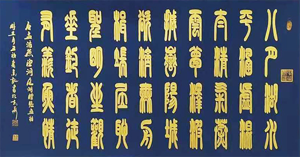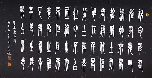书法的最高境界是写心,写思想,写感情。张金龙先生的书法就达到了这一境界,他把传统的书法技巧有机的同现代书法相结合,用抽象奇妙的书法技巧大胆地把篆字写得生动有趣和整体盛威,出神入画。体现出当代书画艺术传承一奇才。被艺术界称之为挥毫泼墨泣长虹,篆书鬼才张金龙。