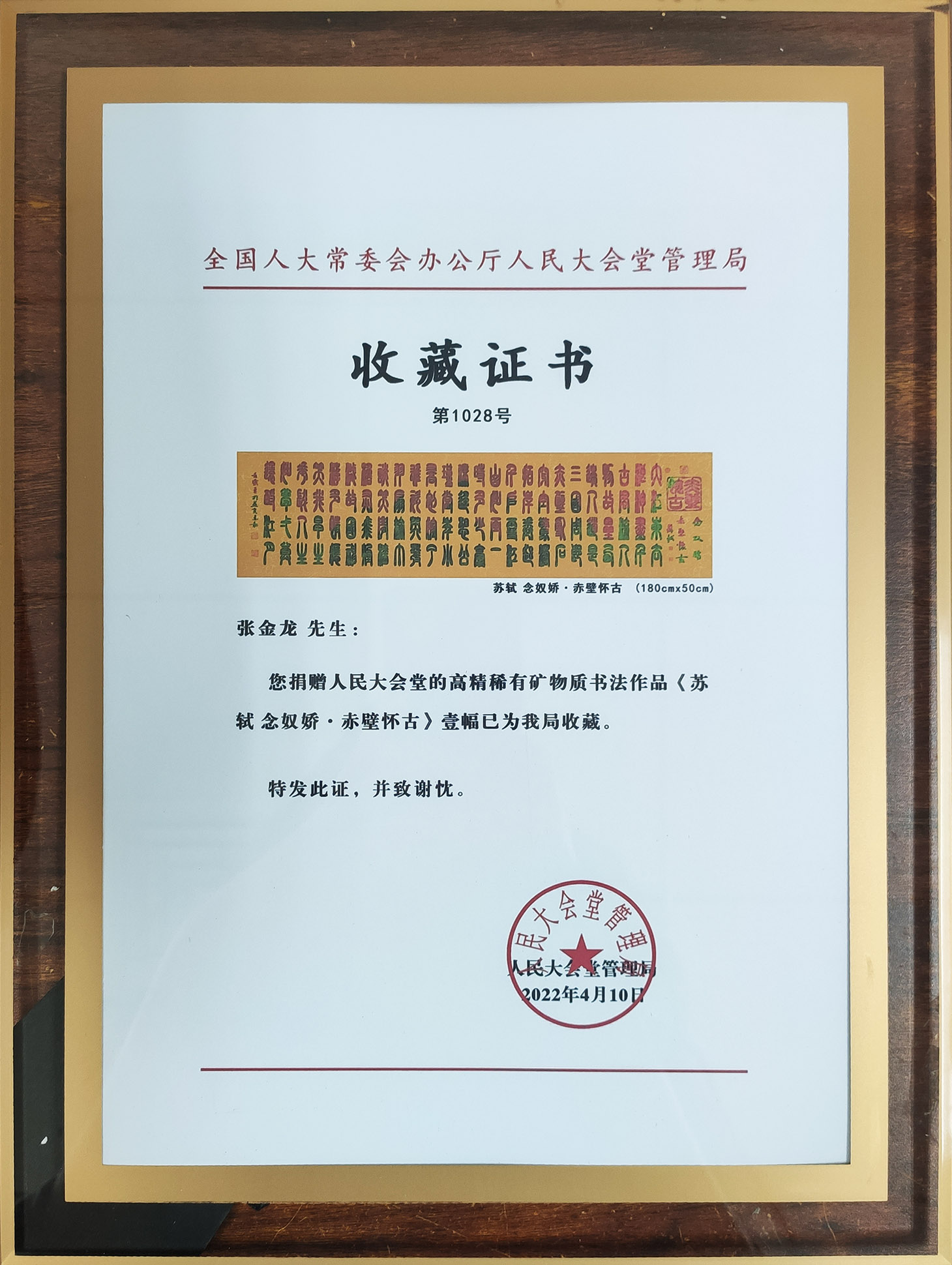 高精稀有矿物质书法作品《苏轼 念奴娇·赤壁怀古》被人民大会堂管理局收藏。