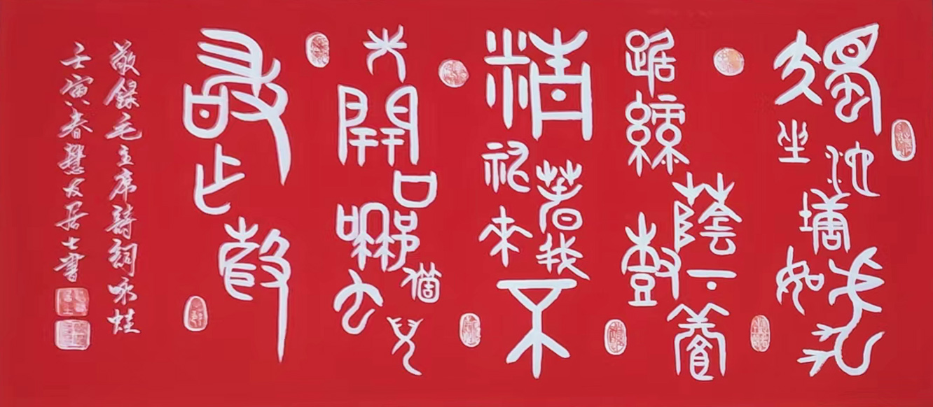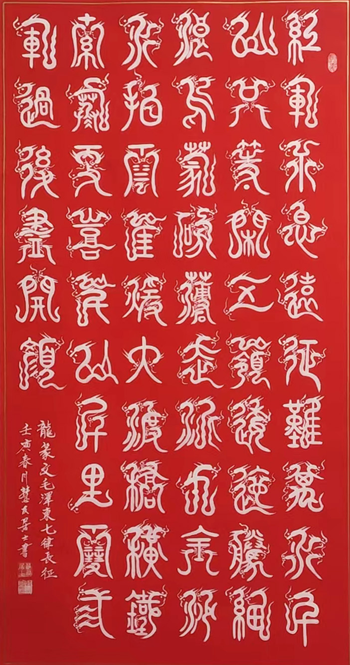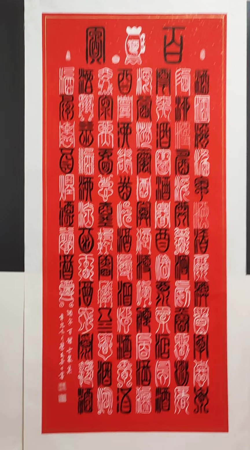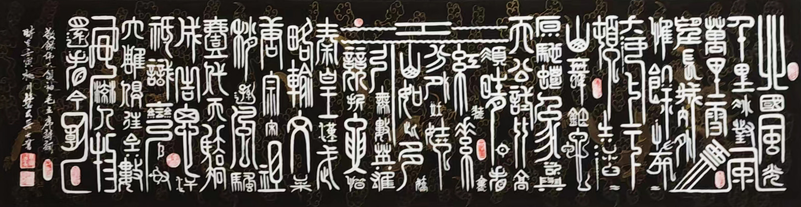 篆书《沁园春·雪》,六尺条黑色龙文宣白墨,获得他诞辰127周年金奖,同款作品被罗马尼亚大使收藏。