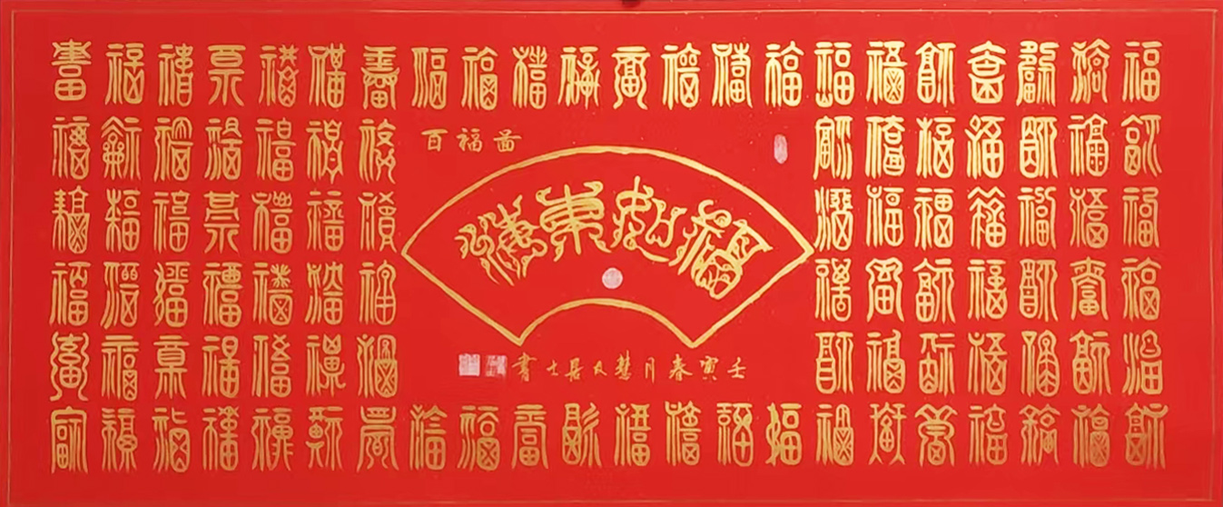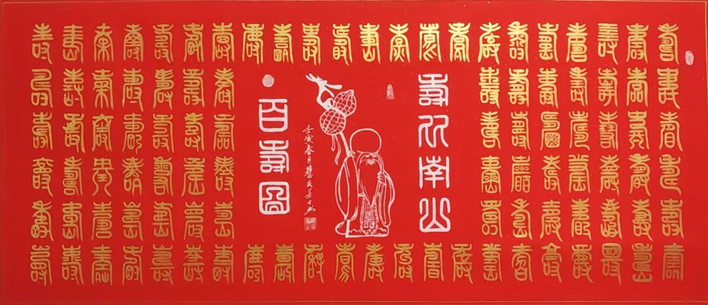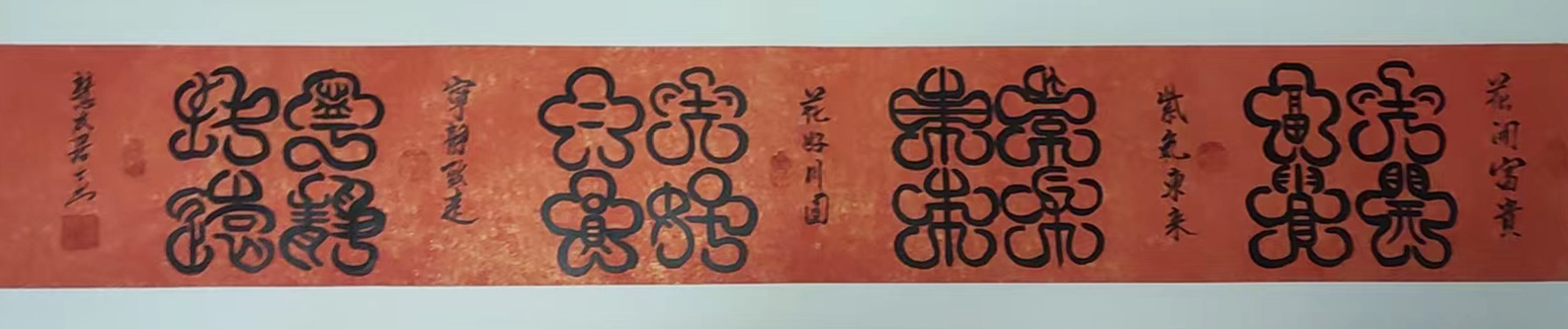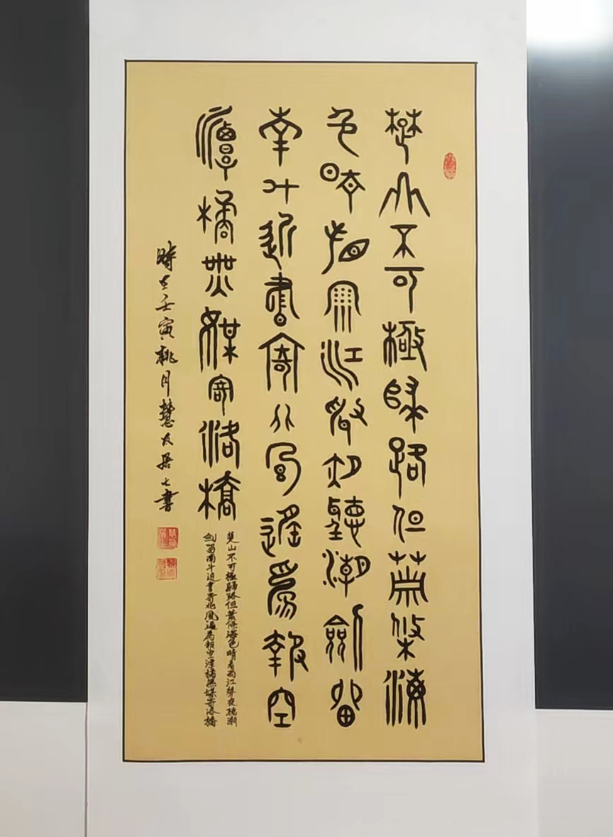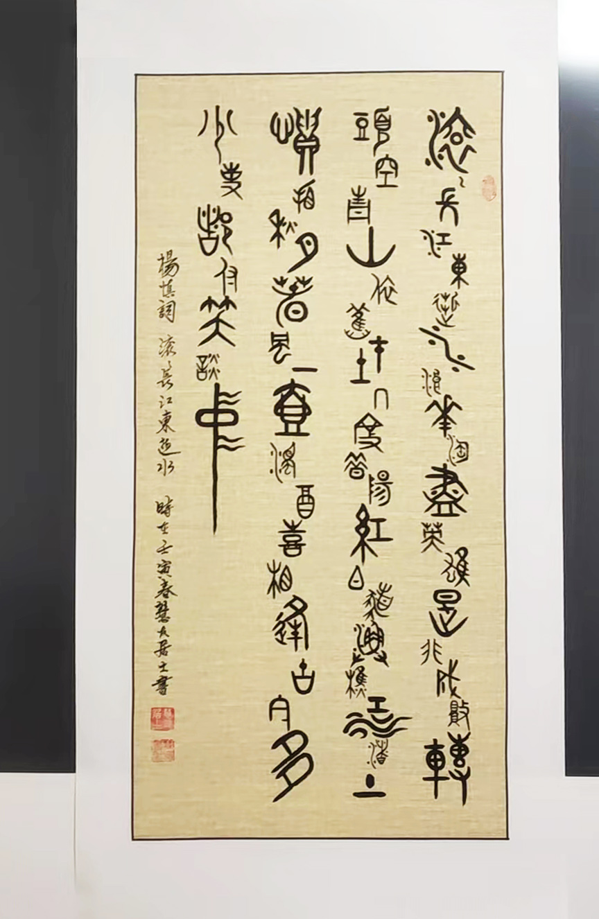 篆书《沁园春·雪》,六尺条黑色龙文宣白墨,获得他诞辰127周年金奖,同款作品被罗马尼亚大使收藏。