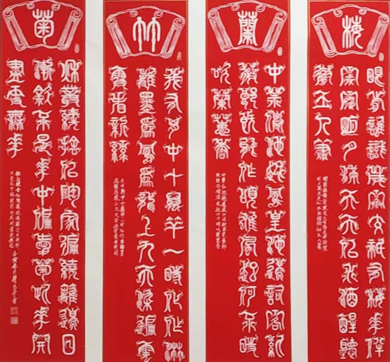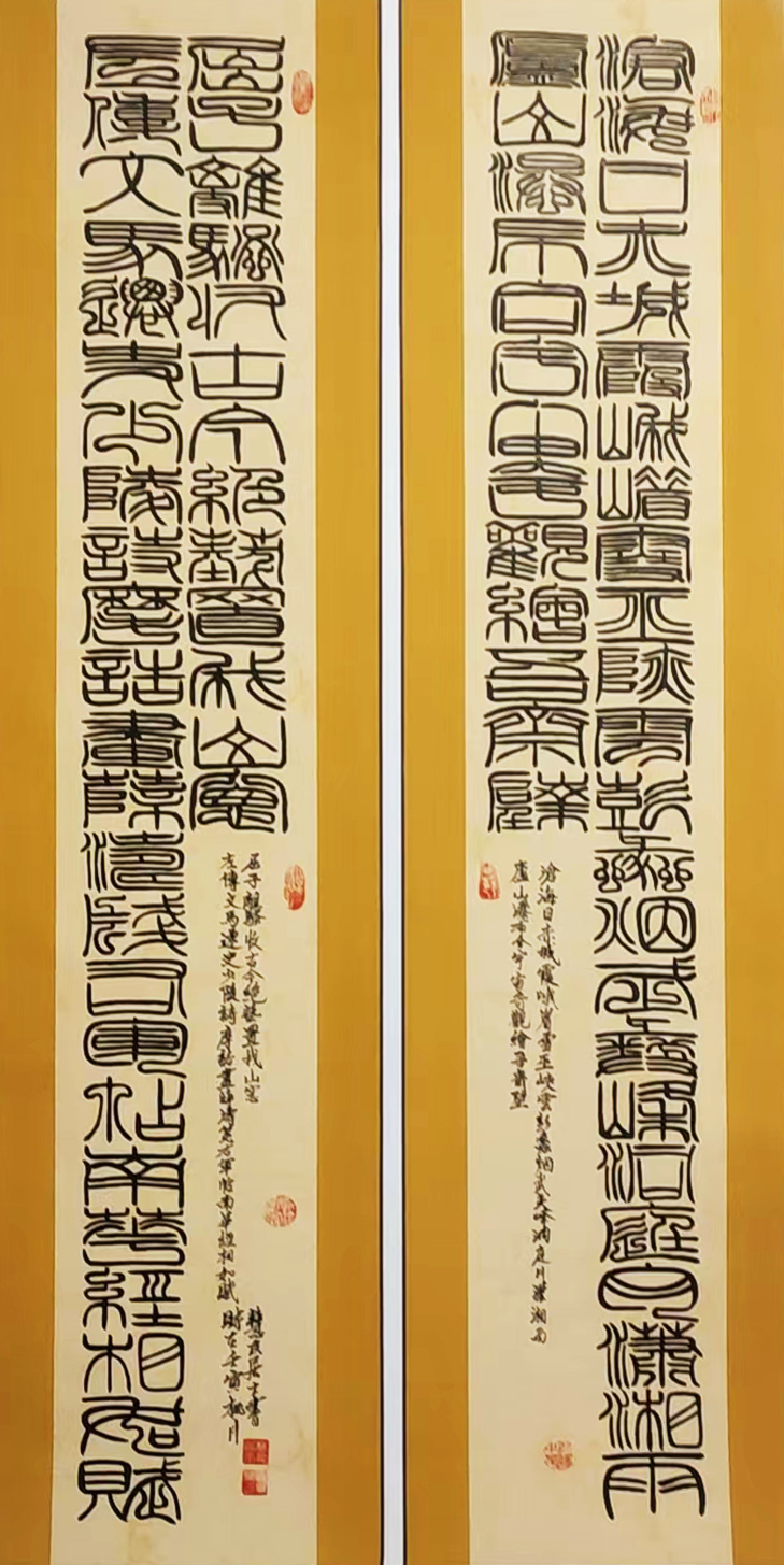 作为当代研究篆书文化的领导先锋,韩学友先生有着丰富的文化修养根基,他研书法的流与变,以图腾为发端,解读仓颉造字的玄机要妙,远取诸物,近取诸身,把文字学放在中华文明泱泱五千年的大背景下,琢磨甲骨文的十万甲片,穷尽篆书在各个时期、各个时段、各种应用场景下的丰姿多神。饱读碑帖,心追手临。是当代书法文化的学人贤家。正是因为带着学术研究与文化弘扬的双重担当,才令他的篆书创作拥有了琼花玉蕊一般的争相绽放。