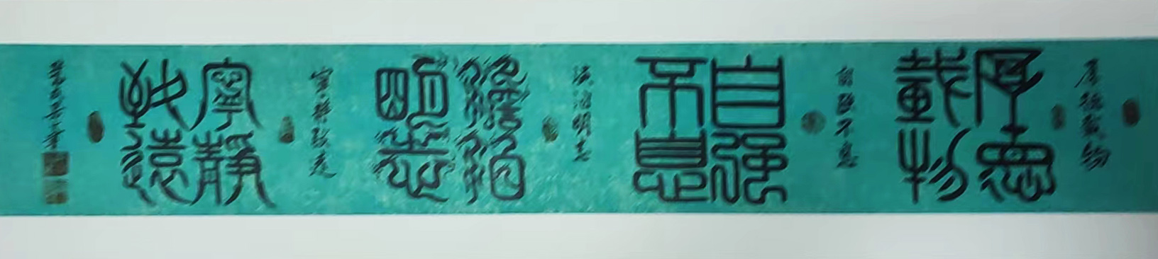 纵观先生的众幅佳作,其作中篆体无不是存朴卓于婉转,具高雅于自然,渊博学养亦是有存乎于字势之间,是可纵以畅达格调,更可置以高古正典!文人情怀,以书载道,不激不厉,风韵独彰!所行篆体皆是有研于碑法,亦有感于范论,是于古篆中汲取养分,更于今时中契合笔意,相参相融,继索升华,厚积而薄发!在一幅作品的统观表现上,是可见于气势之磅礴,也可见于沉稳之雅流,笔调之间更是不作以任何的矫揉唐突之势,而是行笔开合有度,运笔气意并存,笔线大小长短皆是如此!