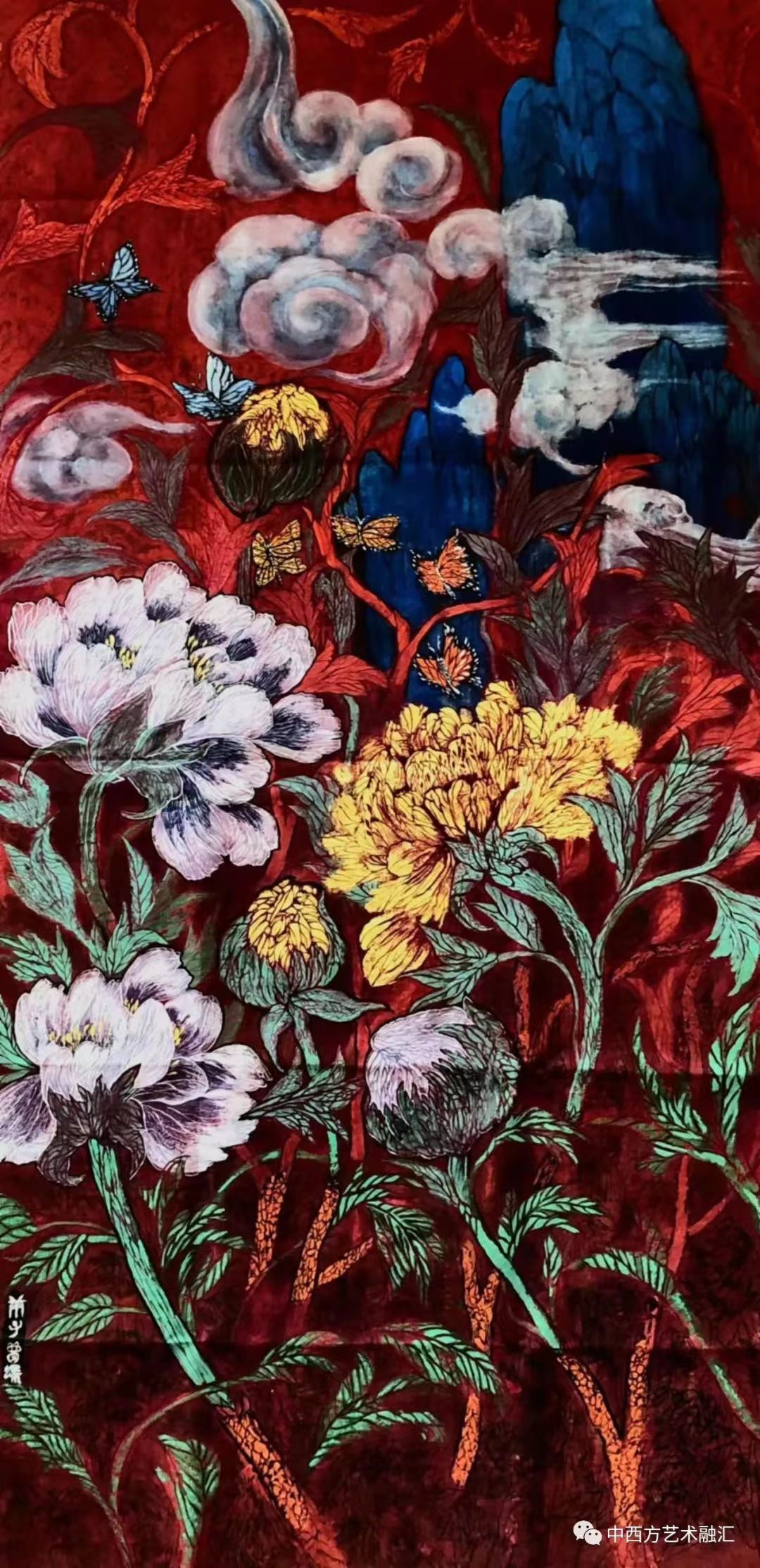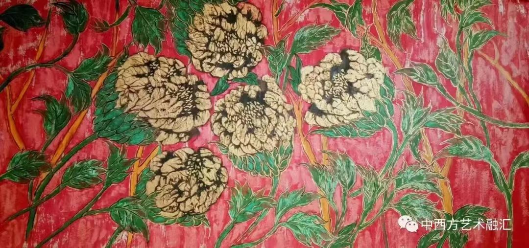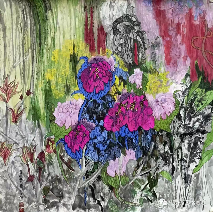近三十年选择牡丹花为主题实验性创作,各种生宣,麻皮纸及矿物颜料和焦墨来表达各种质感效果,及大尺幅画浓墨重彩表达华夏文明的绚丽与沧桑感。