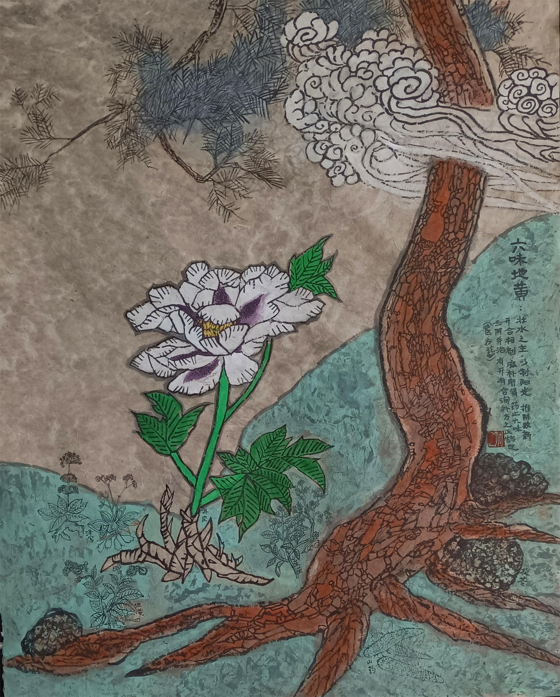 《神农本草.六味地黄》100cm80cm麻纸岩彩画2021年创作