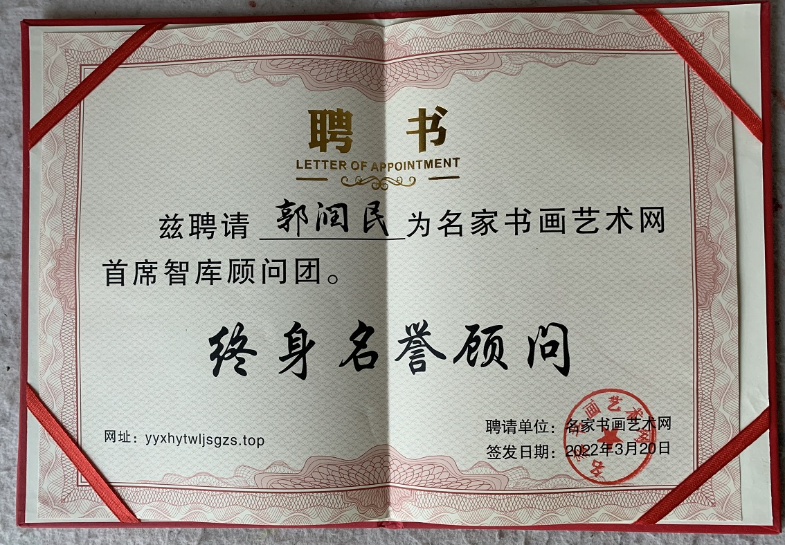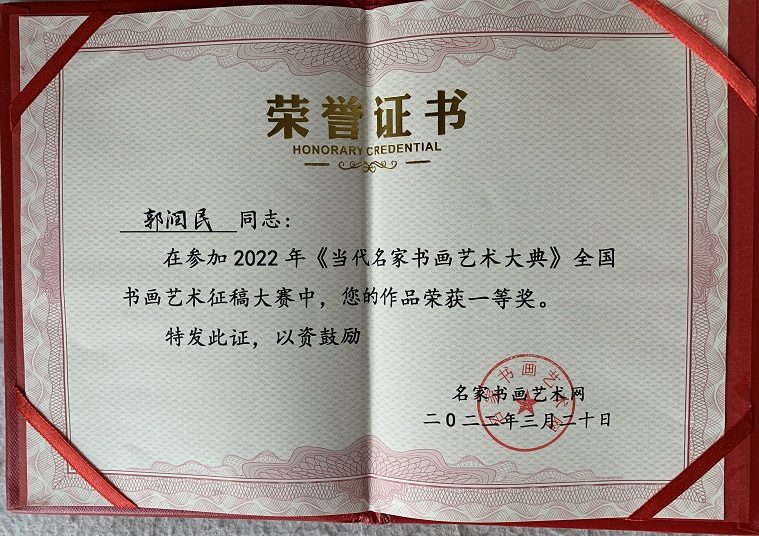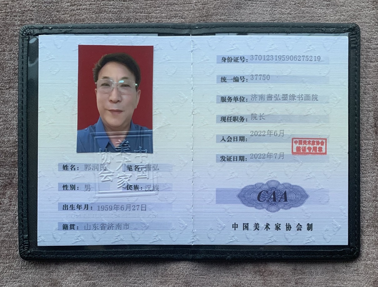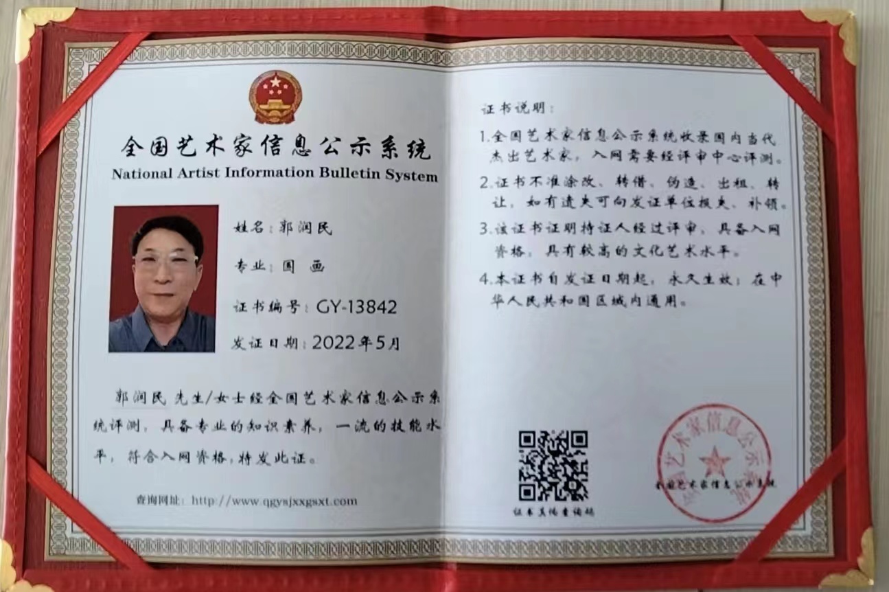 艺术简历:郭润民(笔名:書弘、益康园居士),中共党员,行医出身,现已退休。其自幼酷爱丹青,临池不辍十余载。济南書弘墨缘书画院院长、济南南湖玉露书画院院士。在2022年《当代名家书画艺术大典》全国书画艺术征稿大赛中,荣获一等奖,同时授聘为名家书画艺术网首席“智库顾问团”终身名誉顾问。中国人才报道网誉为“中国新时代国际艺术大家”并入选“全球当代最具影响力艺术家”。被国宾礼书画网聘为荣誉主席。中华人民共和国文化和旅游部和中华人民共和国艺术职称国家美术师职称审定委员会考评、注册为:国家一级美术师。荣获由中国华夏巨匠书画院、中国华夏盛世墨彩书画院、北京名典墨韵艺术中心举办的“笔墨随时代·丹青颂党恩”向中国共产党第二十次全国代表大会献礼宣传活动重点推荐艺术名家。中国美术家协会会员。