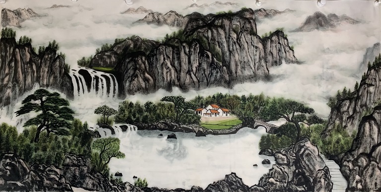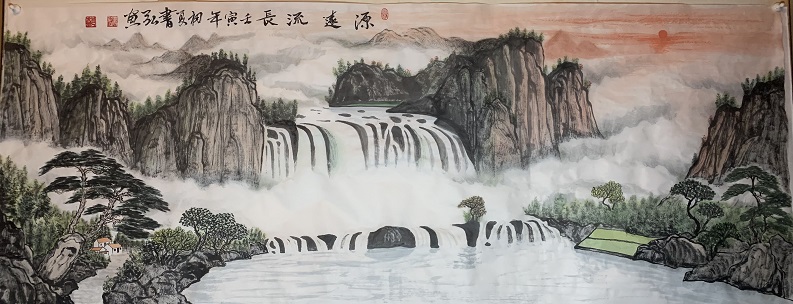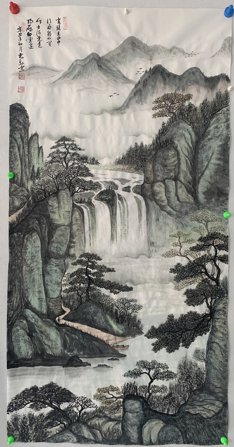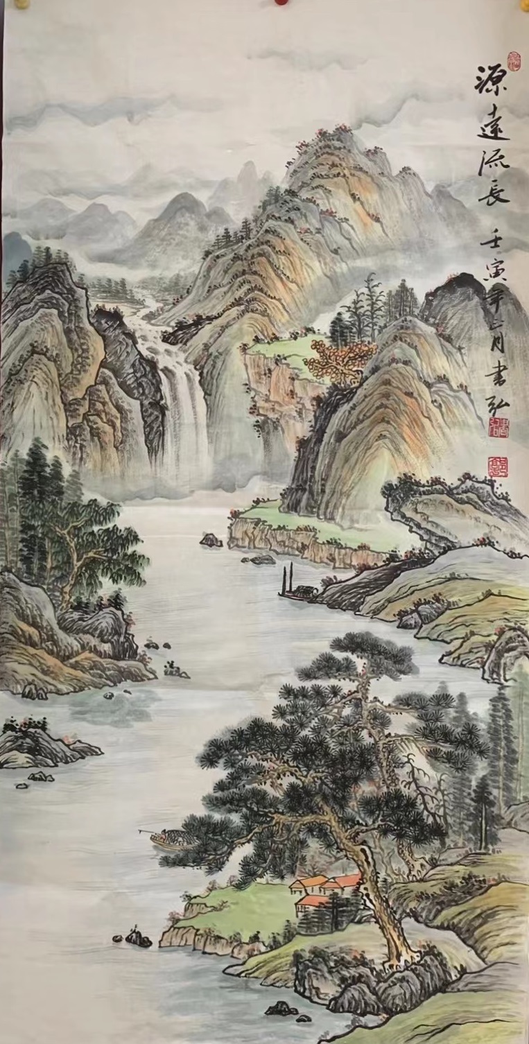 書弘的山水,讲究容众家之长,笔墨气韵形神兼备,其将绘画同所掌握的中医基础理论相融合。作画尽量遵循自然和谐、阴阳、冷暖(寒热)、虚实调和。他气势恢宏的构图,酣畅淋漓的墨迹渲染,用笔奔放快捷,抑扬顿挫,画面秀逸,气韵生动,画出了云蒸霞蔚、气势峥嵘。他的山水花鸟画写实到栩栩如生,气息绵绵不绝;写意到如泉流淌,欢畅无滞、如风拂面、清新扑鼻。其所画(山水)江山秀美,气势磅礴,笔触遒劲有力,画风泓远,让人心旷神怡。读書弘的画更读懂了他画外的禅意、空灵、坚实、厚重,给人给人一种自然的美。