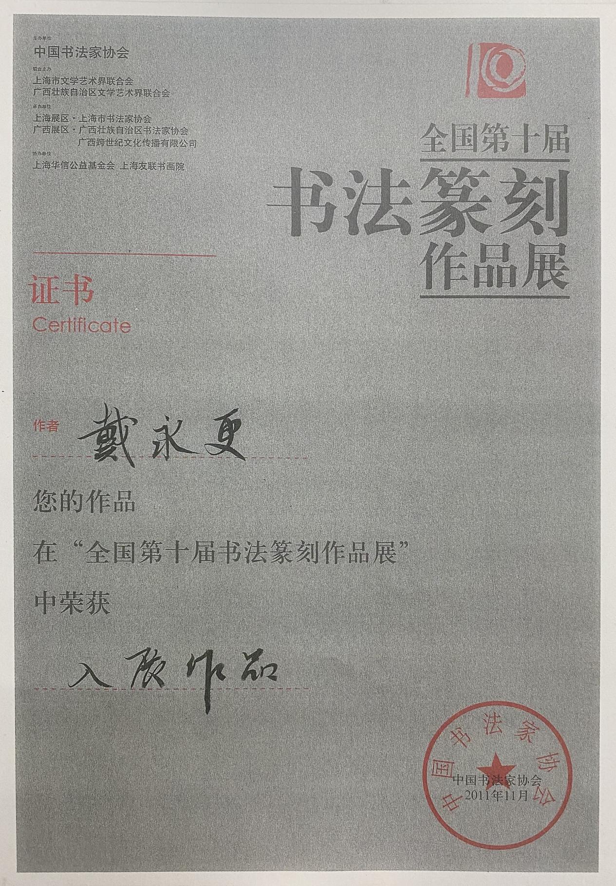 全国第十届书法篆刻作品展一等奖