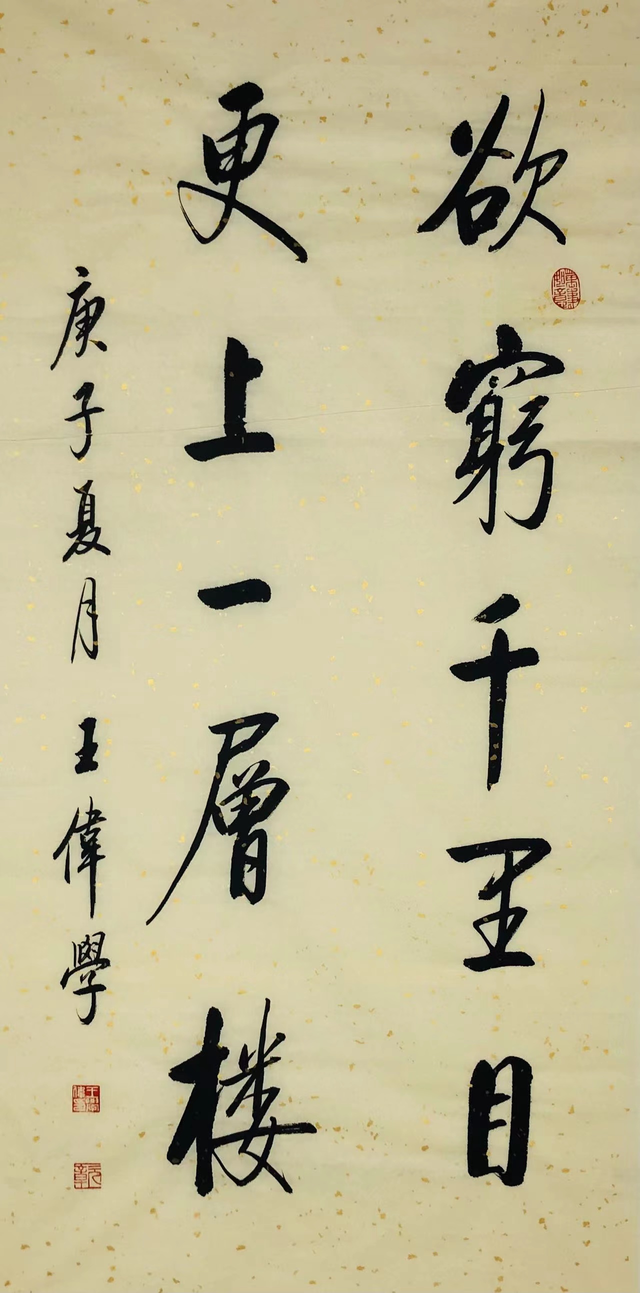 王伟学先生自幼酷爱书法,习二王书风,学米芾笔法,临池不辍,得各家之长,精心钻研,渐成一格,在结构和笔画上,外敛秀整而内钢铁骨,瘦劲挺拔,骨骼分明,气派大,撑得开;用笔简练、爽利,清健而不秀媚,瘦硬而不多露圭角,用笔上没有华丽的装饰性用笔,结字严谨,特别是楷书和行书形成了自己独特的书写风格,堪称当代一流高手。书界评其书法为“外柔内刚、自然洒脱、清隽儒雅”。其作品显示出深厚的功底与良好的人文素养,在业内具有很强大的影响力和超高的人气。
