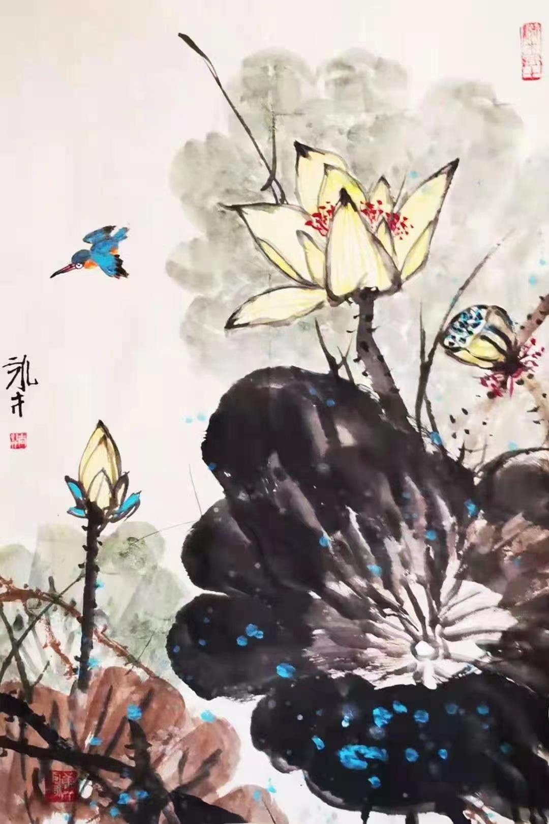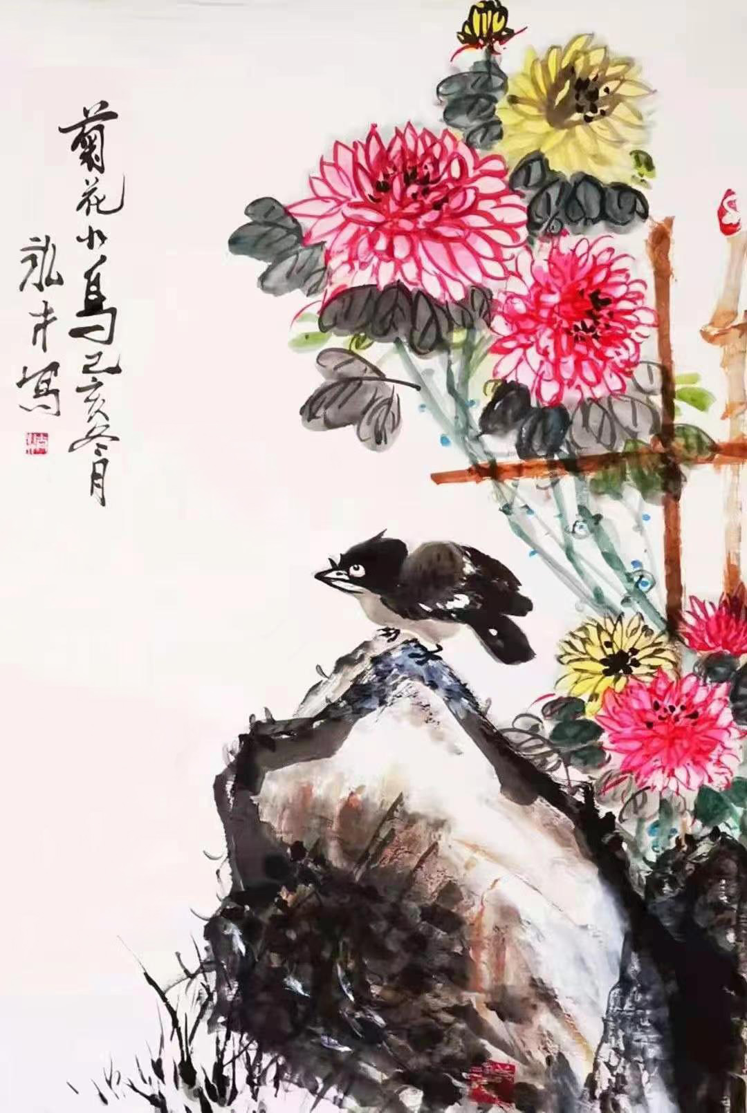 2001年“菊花小鸟”作品参加“伟大丰碑”全国书画院,在中国革命博物馆展出。