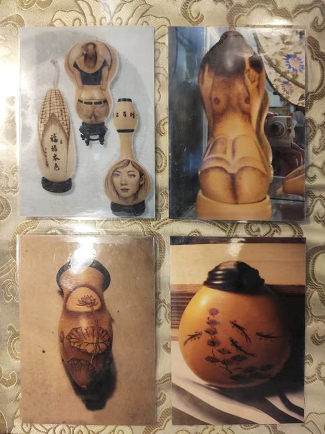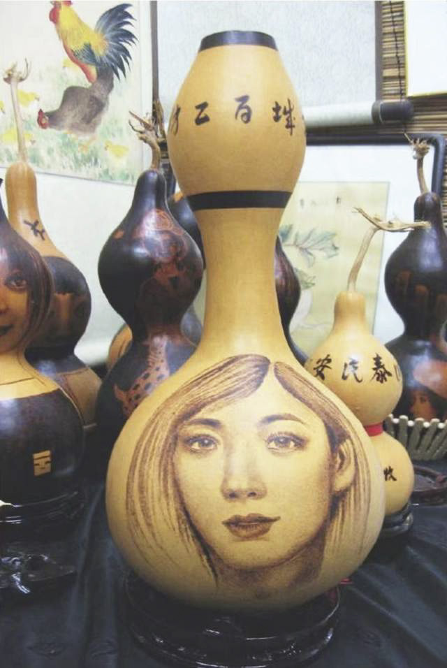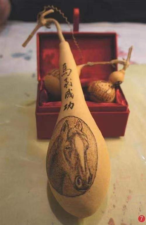 “我从小学4年级就开始画画,自己的婚姻也是因画结缘。从小因为能画所以一路下来担任了各种绘画工作,分到兵工厂的时候,画了很多大型广告画。油画、国画什么的都干过。后来,我曾在媒体干过一段时间,因为金融危机的关系,所在集团破产,我所在的办事处也被撤销。之后我决定自己开一个画馆,正是这个画馆让我接触到火绘葫芦的圈子,当时一下就感觉特别能接受。”