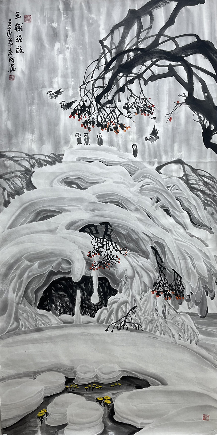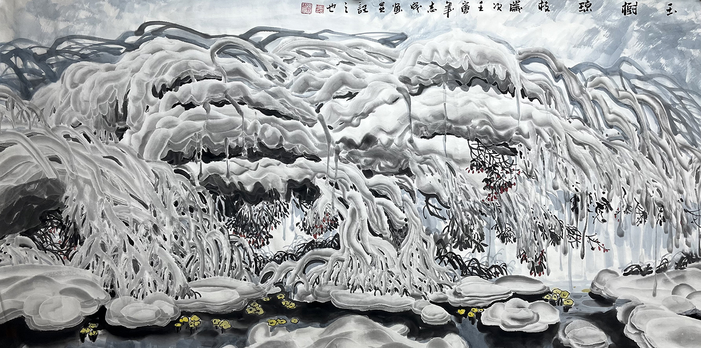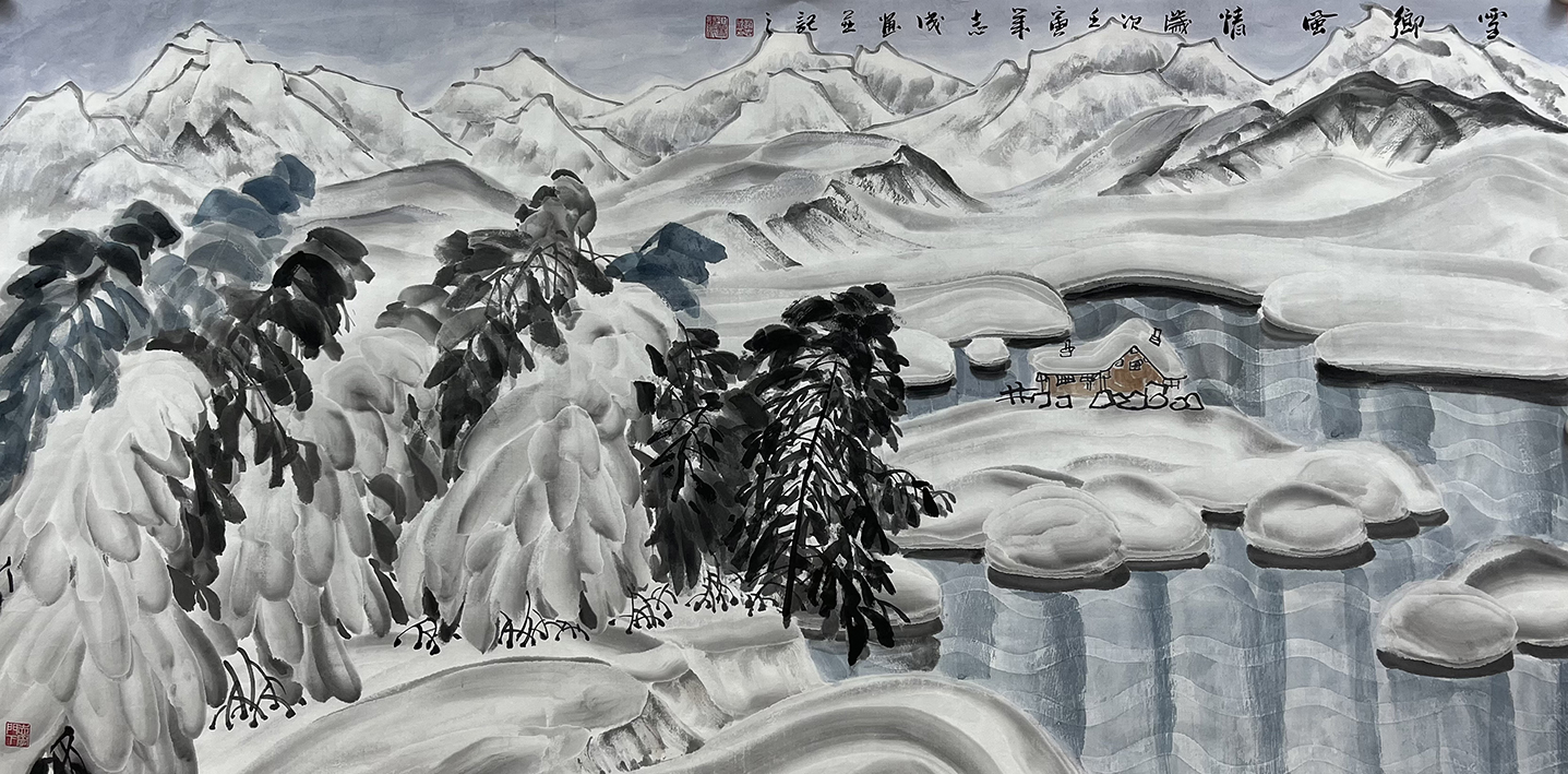 他利用特殊定制的双层夹宣,矾墨结合,运用光学原理及中国传统文化“易经”阴阳互补的原则,使其作品独具强烈冰质感的冷逸之美。最为独特的一点是他创作作品时有百分之九十是在反面进行,把纸翻过来才是画的正面,与满纸雪白形成强烈的视觉效果,他的作品区别于普通的雪景画,更加突出一种冰天雪地,粉妆玉砌之感,笔墨百凡,情景交融,一跃成为中国“首位冰雪山水国宾礼特供艺术家”。