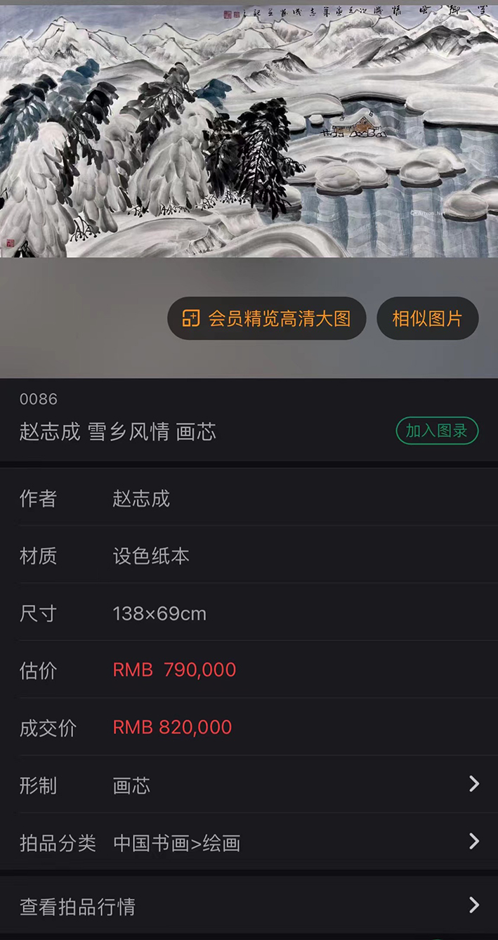 近年来冰雪系列作品在市场一路看涨,引起了投资爱好者的广泛关注。中国冰雪山水创始人于志成先生2020年东兴瀚海拍卖会《塞外风光》拍得RMB1300万,《北国风光》拍得RMB1100万,奠定了冰雪系列作品在投资市场的不替代的地位。与此同时被誉为“中国画坛第一冰”赵志成崭露头角,屡创拍卖成交纪录。作品《雪乡风情》以最终83万成交,作品《岁寒傲冰雪》再次刷新纪录,拍出92万,单平尺最高突破4.5万。相关投资专家认为,冰雪画作是投资市场的一片洼地,赵志成作为“中国画冰第一人”,作品价格仍会继续不断上涨,升值趋势不可小觑,非常值得收藏投资。