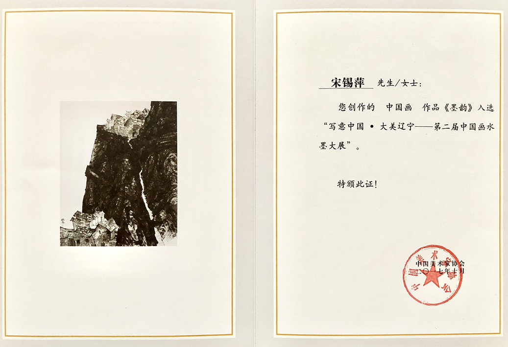 2017年 国画作品《墨韵》入选中美协举办的《大美辽宁写意中国》全国画展,并被收藏