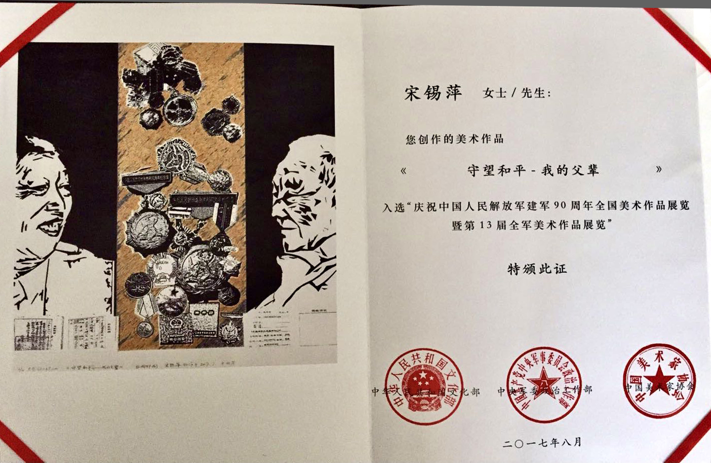 2017年版画作品《守望和平-我的父辈》,入选在 中国美术馆 由中美协举办的《庆祝中国人民解放军建军90周年全国美术作品展览暨-十三届全军美术作品展览》获奖;