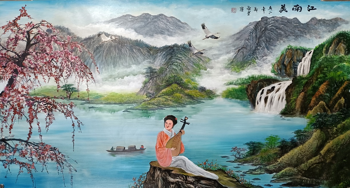 郑金赛先生作工笔山水,有师法古人的价值观,也有师法自然的进取力。师古人,取上法。通过对历代名家作品的精研覃思,心追手临,取法为上的路径走得特别扎实,终于是获得了得法亦为上乘的真功夫。所以看他的山水作品,就有沈周山水的形神兼备,色彩流丽,极是一天清淑气,万里碧榆风的好气象。也有仇英山水的极致工细,画物象必是精益求精,一丝不苟。怪不得先生画性超人,其丹青才华在大江南北深有佳论!取古人之法,让他的山水作品最有古今永传的文化格局。