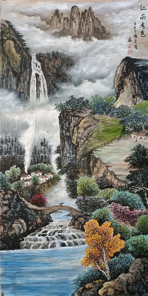 龚贤又论,师人还需师造化。造化里有性灵有神通,郑金赛先生从来不把自己闭锁在一间小小的画室里臆构山水,必有观览真山真水的修行!山水安知董与黄?唯有像郑先生这样,有心泊山水的视觉体验,才可以把山水传达出来的性灵纳于心田,然后输出于笔端,实现外师造化中得心源的创作理念。正是因为有师自然的经年习成,所以他的山水作品真实天质,经过骨法用笔的塑造,完见应物象形的真实。再经由随类赋彩的渲染,必见气韵生动的佳妙!由是,其山水作品雅俗共赏,有专业层面浩然一统的影响力,也有大众审美层面可以装饰万家屏障的号召力!山水创作,达到这种境界,必然是技法精湛,功勋卓然!